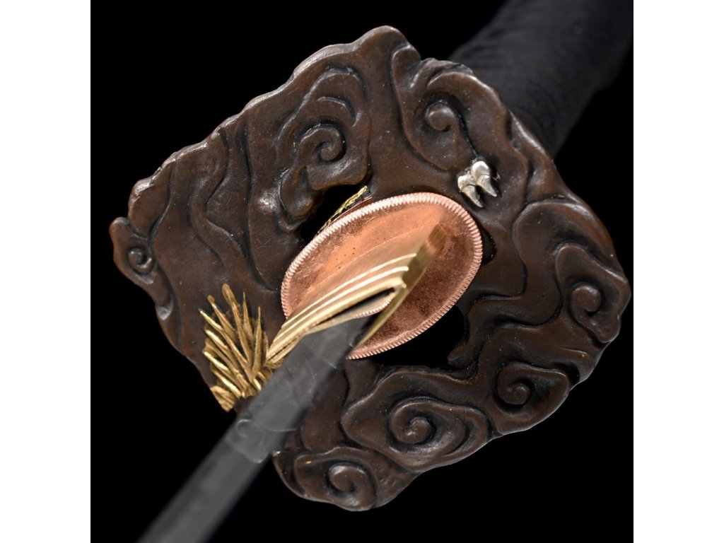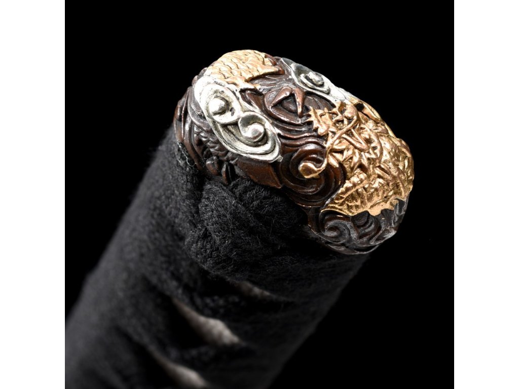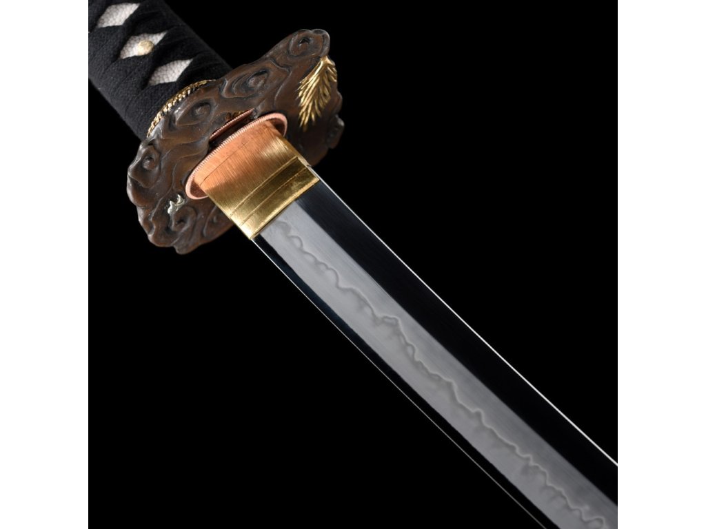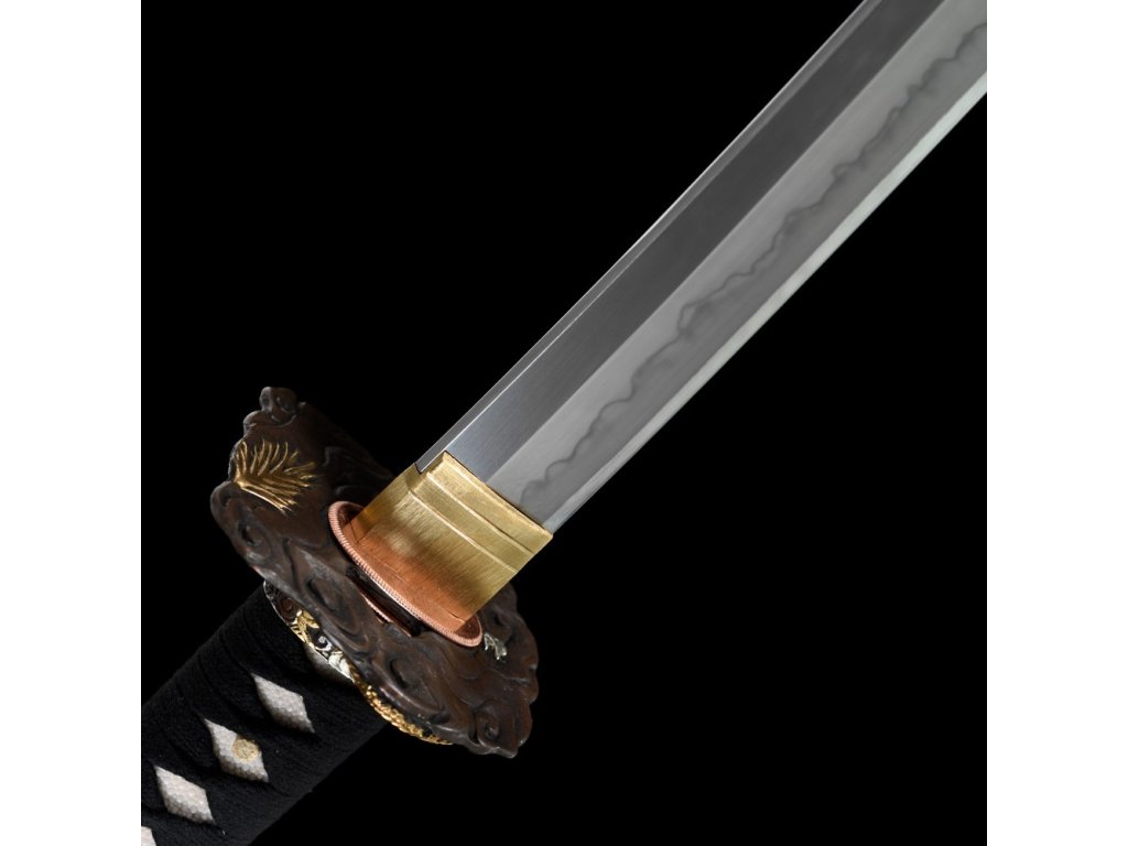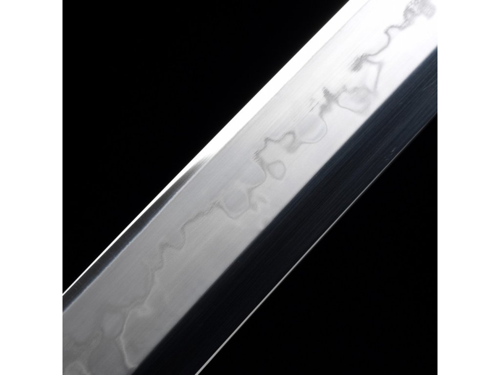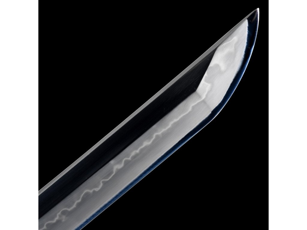 Ručně kovaná čepel z oceli T-10 té nejvyšší kvality. Ocel byla laminována v monokompositní konfiguraci Maru - diferenciálně tvrzená. Uhlíková ocel T-10 (obsah 1,1% uhlíku a 0,4% manganu) je velmi pevná a skvěle drží ostrost. Čepel bez žlábku bo-hi byla ve finální fázi ručně leštěna kamenem hazuya - tím je dosaženo téměř žiletkového ostří (razor sharp) a zrcadlového lesku.