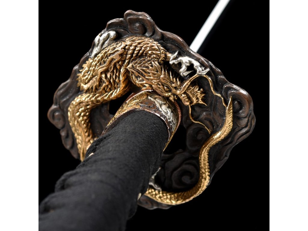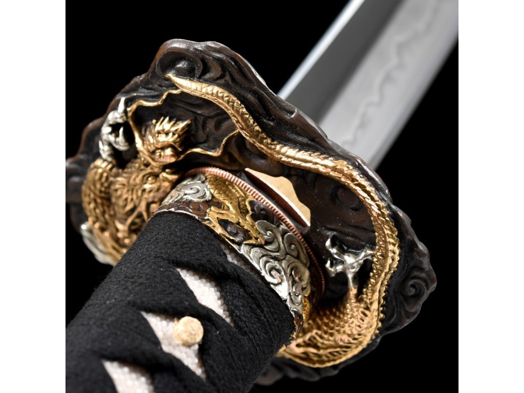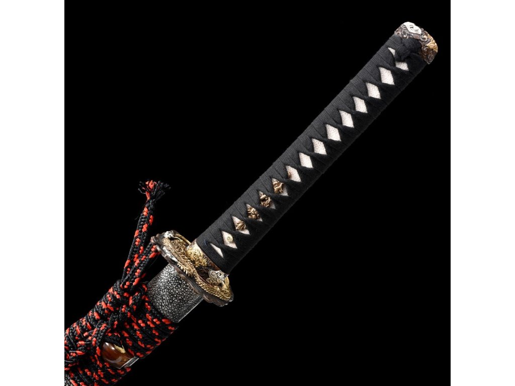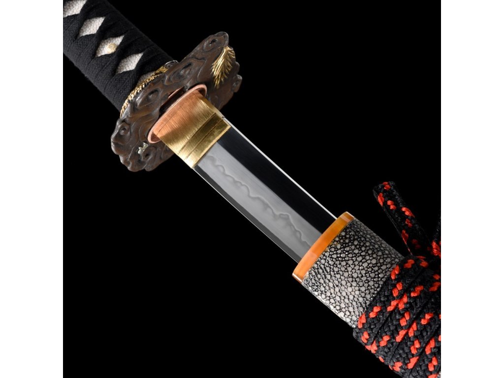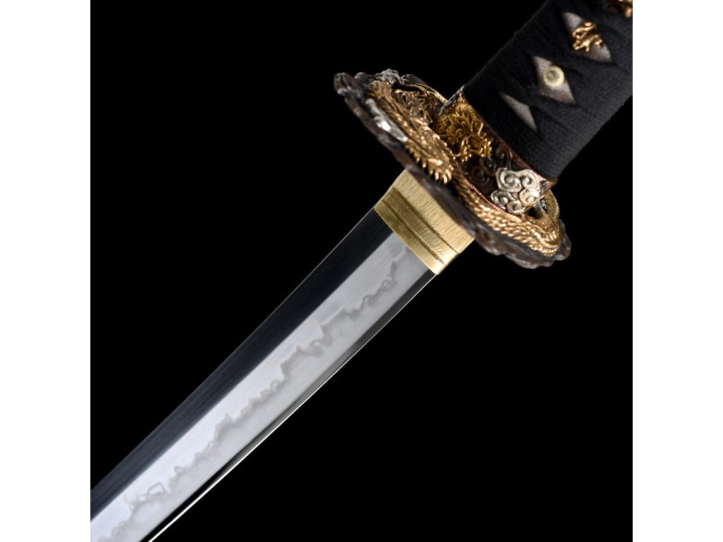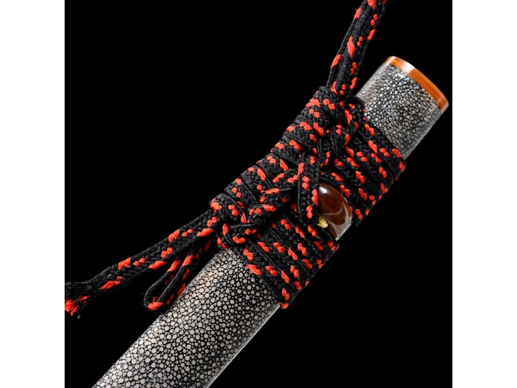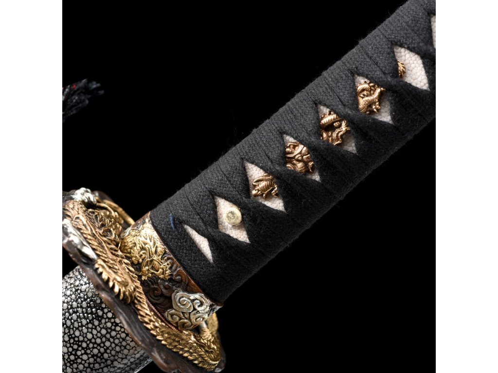 Výrazný reálný Choji hamon je tvořen dle dávných tradičních metod, které vychází z mnohaletých zkušeností kovářského mistra, který výrobou této nádherné zbraně strávil několik dnů. Vše na tomto meči je individuálně zhotoveno, včetně saye a habaki, jsou použity nejkvalitnější komponenty, včetně špičkového laku na sayu a skutečné rejnočí kůže nejvyšší kvality. Jedná se o špičkovou repliku samurajského meče, která je vhodná k sekovým zkouškám a lze ji rozložit na jednotlivé části. Tato čepel byla vyzkoušena a testována tak, aby odstranila vše co jí stojí v cestě ! Sori (zakřivení čepele) je speciálně navrženo tak, aby bylo dosaženo co možná nejjemnějších a nejčistších řezů. To vše v kombinaci s výběrem tradičního kovaného Koshirae zaručuje, že získáte to nejlepší z hlediska vzhledu i funkčnosti. Uhlíková ocel T-10 má působivou tvrdost HRC 58 - perfektní kombinace této tvrdosti je podtrženo zakřivením čepele Sori, které umožňuje snadné přeseknutí tatami, slaměné rohože, nebo bambusu pro tameshigiri. Full tang konstrukce této katany výrazně zvyšuje sílu meče. Čepel je typu shinogi-zukuri, tento typ čepele se vyrábí od 10.století našeho letopočtu. Hrot meče ko kissaki se skutečným Diamond-Shaped Yokote, které je velmi dobře definováno tím, že hamon prochází po celé délce přes Boshi. Yokote je velmi důležité pro strukturální integritu špičky meče. Pomáhá absorbovat otřes, rozptýlí sílu a přispívá k stabilitě a síle meče při tzv. sekořezu. Tato katana (samurajský meč) je vhodná na použití v praxi, firma Dellinger se však zříká jakékoliv odpovědnosti za zranění a poškození vzniklá při použití. Schraňujte mimo dosah dětí ! Jakákoliv manipulace se samurajským mečem je na vaší vlastní odpovědnost. Nezapomeňte, že máte ve svých rukou smrtící zbraň !