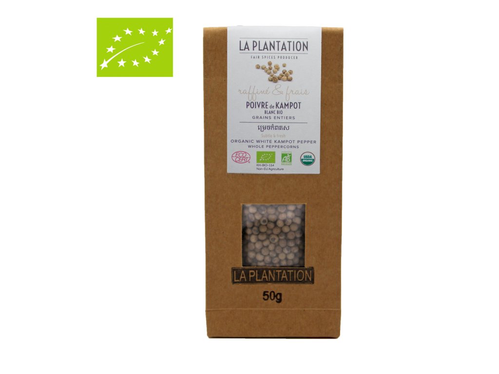 Bílý Kampotský pepř se vyrábí z plně zralých bobulí, které se po sklizni namáčejí, aby se odstranila jejich červená slupka, a následně se suší na slunci. Výsledkem je pepř s jemnou, komplexní chutí, ve které se snoubí decentní pikantnost s nádechem květinových a citrusových tónů.