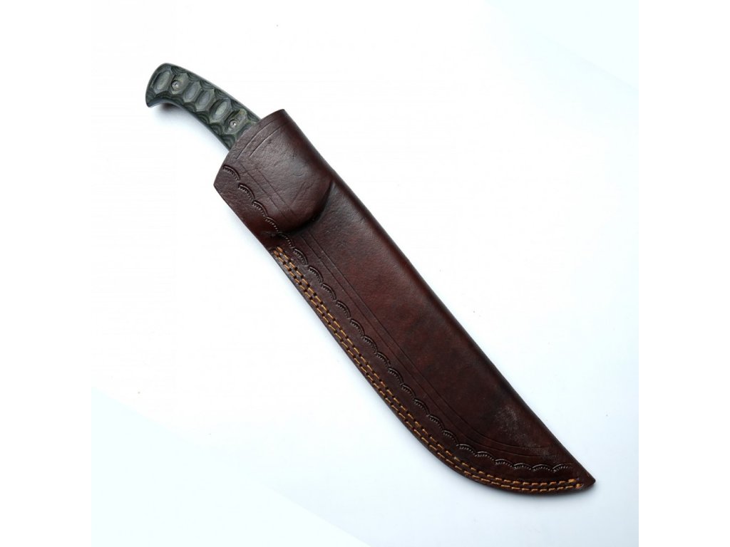 Odolná damašková mačeta Dellinger Overland s čepelí z uhlíkové damaškové oceli s rukojetí z mikarty. Ručně kovaná, ostrá mačeta, vhodná do kuchyně i pro outdoor a survival. Dodávána s koženým pouzdrem.
