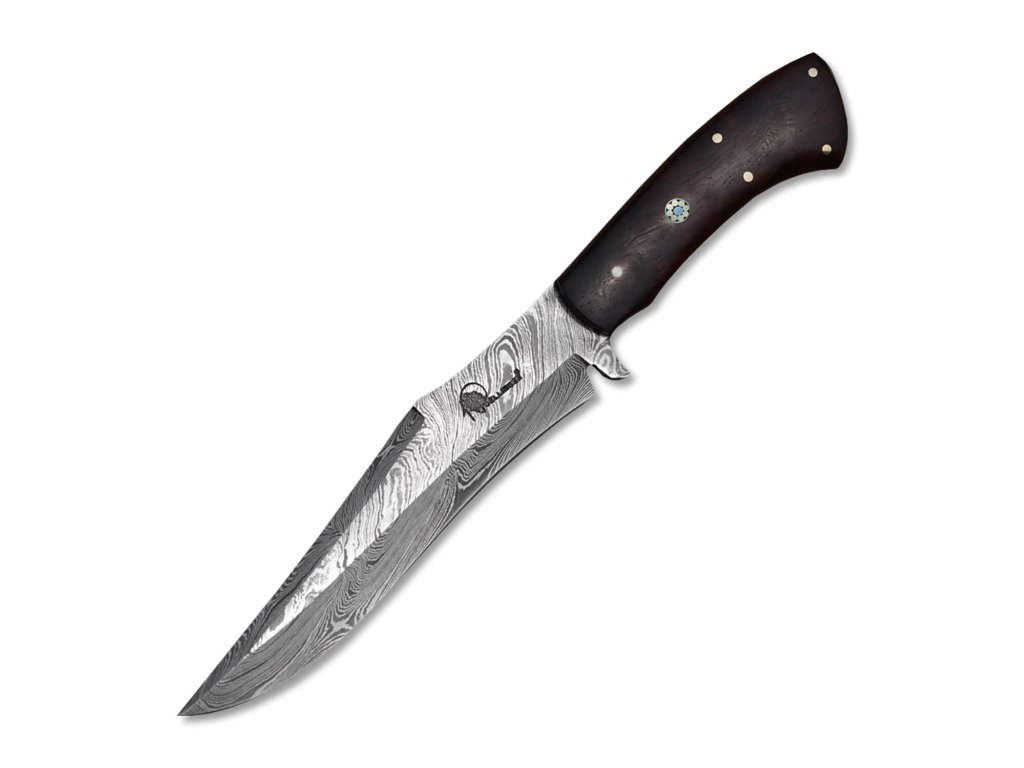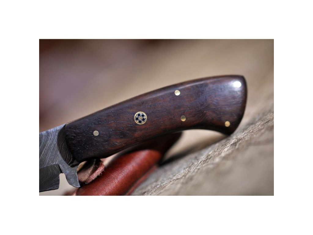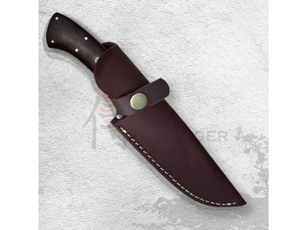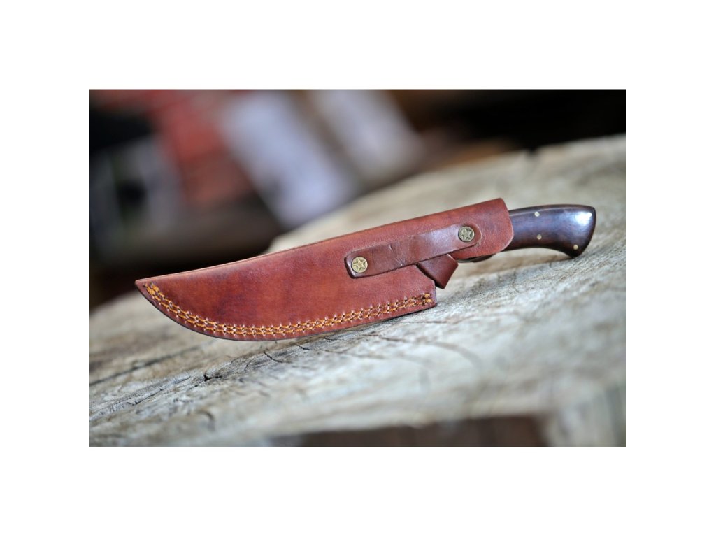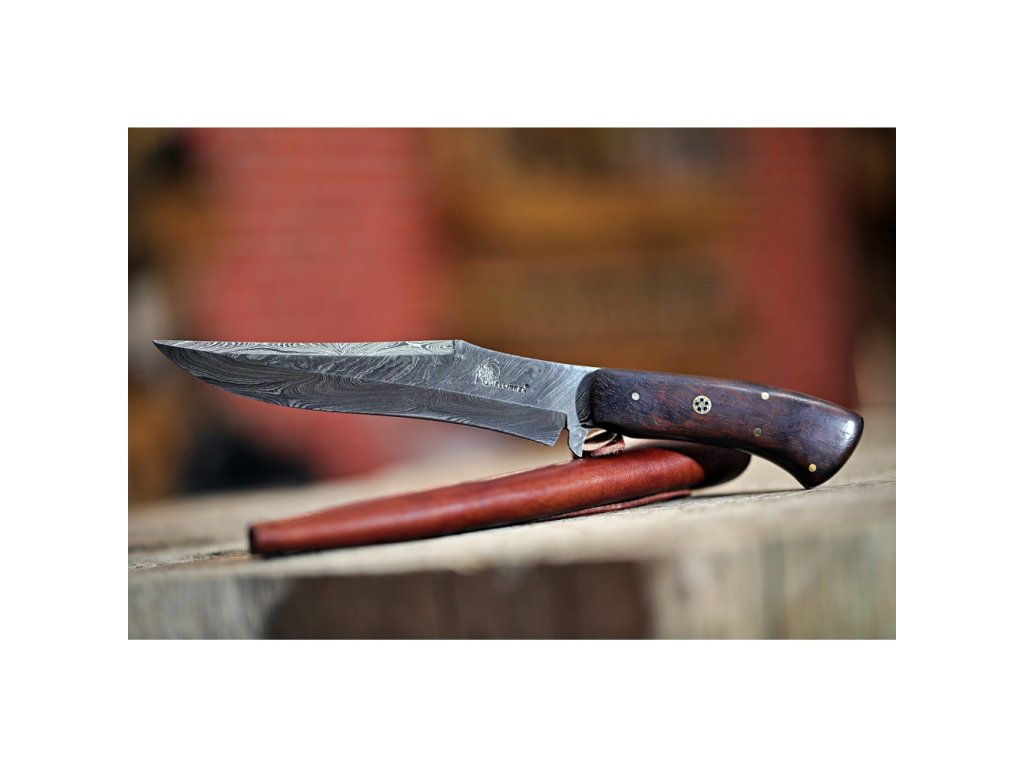 Odolný lovecký nůž s čepelí z damaškové uhlíkové oceli a rukojetí z tvrdého pouštního dřeva iron wood. Snadno se brousí, skvěle padne do ruky a je dodáván s koženým pouzdrem.