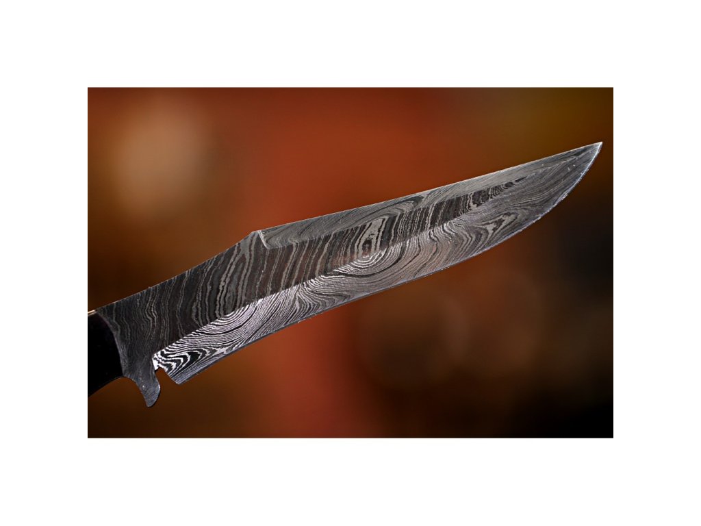 Čepel tohoto pevného loveckého nože je vyrobena z damaškové uhlíkové oceli, kdy vyšší obsah uhlíku přispívá k její větší tvrdosti a odolnosti materiálu, snáze se brousí. Nůž není nerezový. Díky tomu je potřeba o čepel také více pečovat - pravidelná údržba, včetně vytření do sucha po použití a následném naolejování - tím minimalizujete riziko koroze. Rukojeť je vyrobená ze dřeva iron wood. Toto pouštní dřevo je jedno z nejhustších a nejtěžších dřev na světě. Je poměrně složité ho opracovat, ale výsledek poté vydrží velmi dlouho. Nůž je dodávaný s koženým pouzdrem.