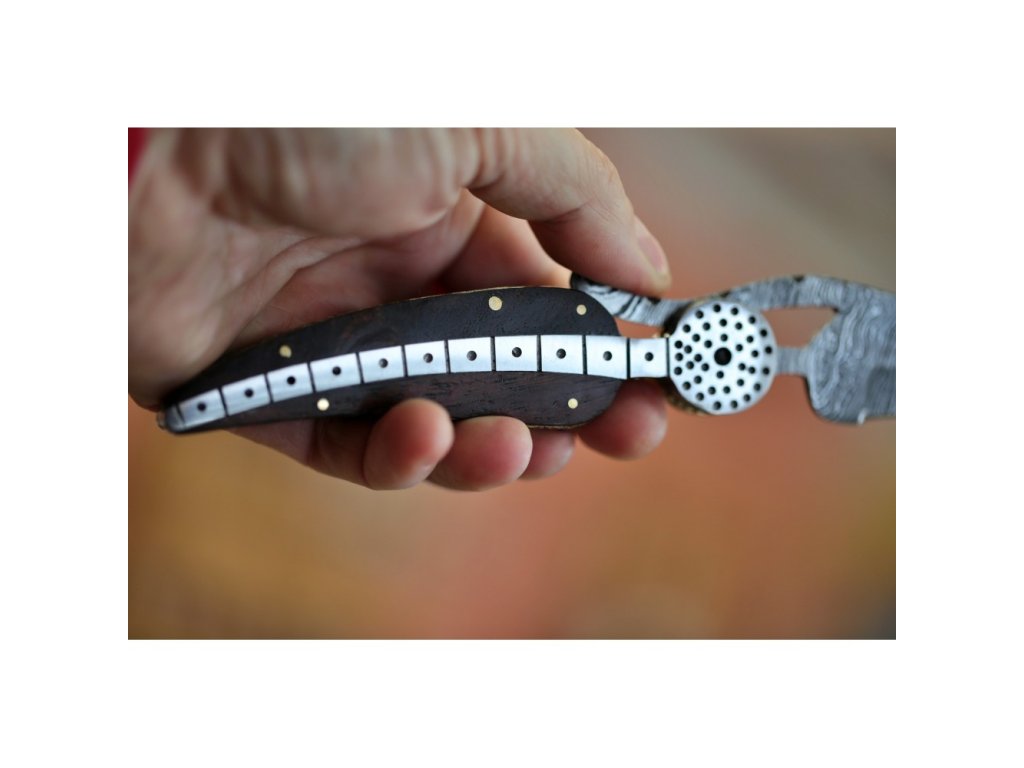 Nůž není nerezový, což vyžaduje pečlivější přístup – po každém použití čepel vytřete do sucha a pravidelně olejujte, abyste předešli korozi. Rukojeť z exotického palisandru v kombinaci s damaškovým kováním dodává noži luxusní vzhled. Unikátním prvkem je otevírací a zajišťovací páčka chiriki, inspirovaná legendárními japonskými noži Higonokami. Tento praktický zavírák je dodáván v ručně šitém koženém pouzdru.