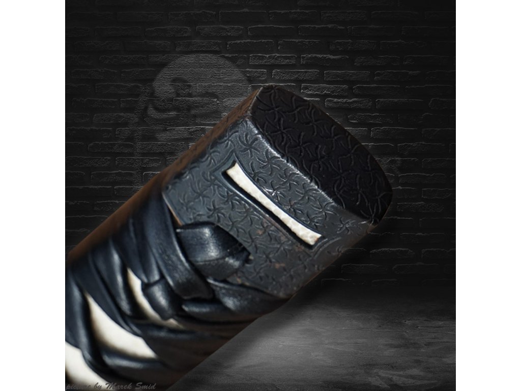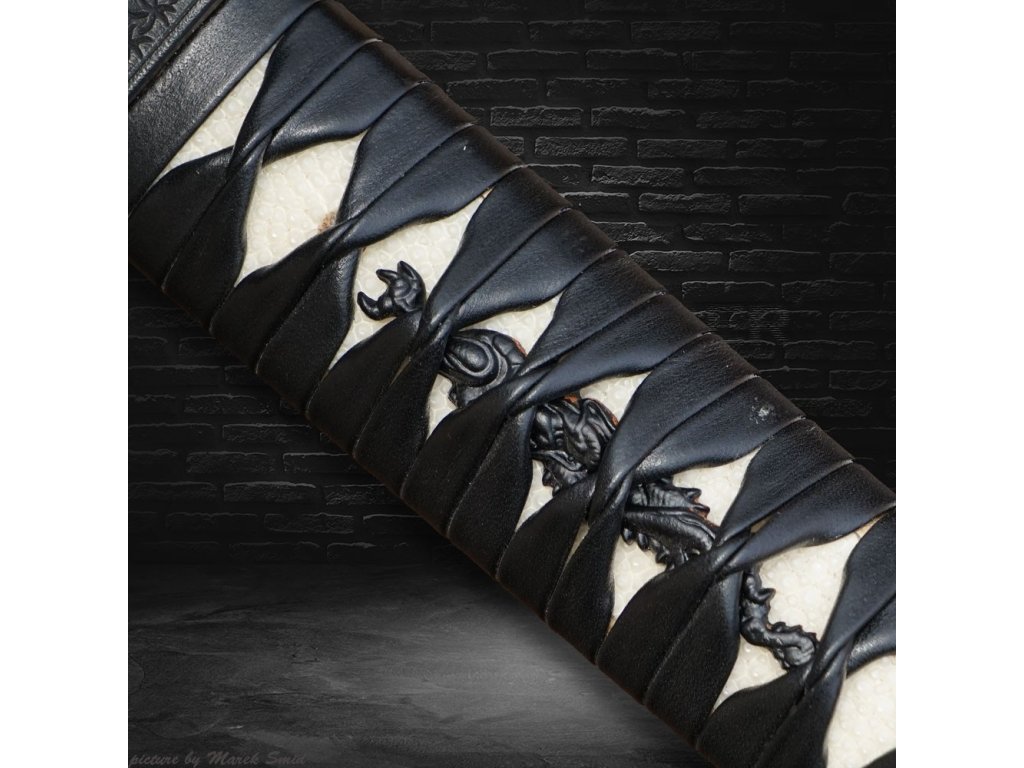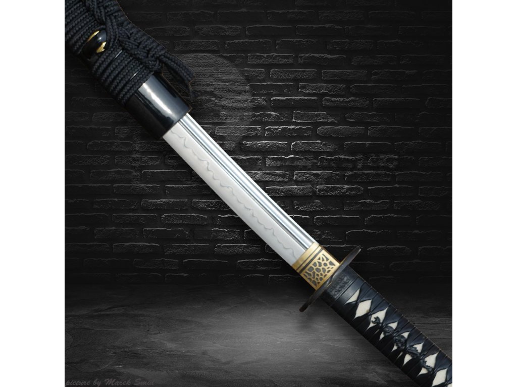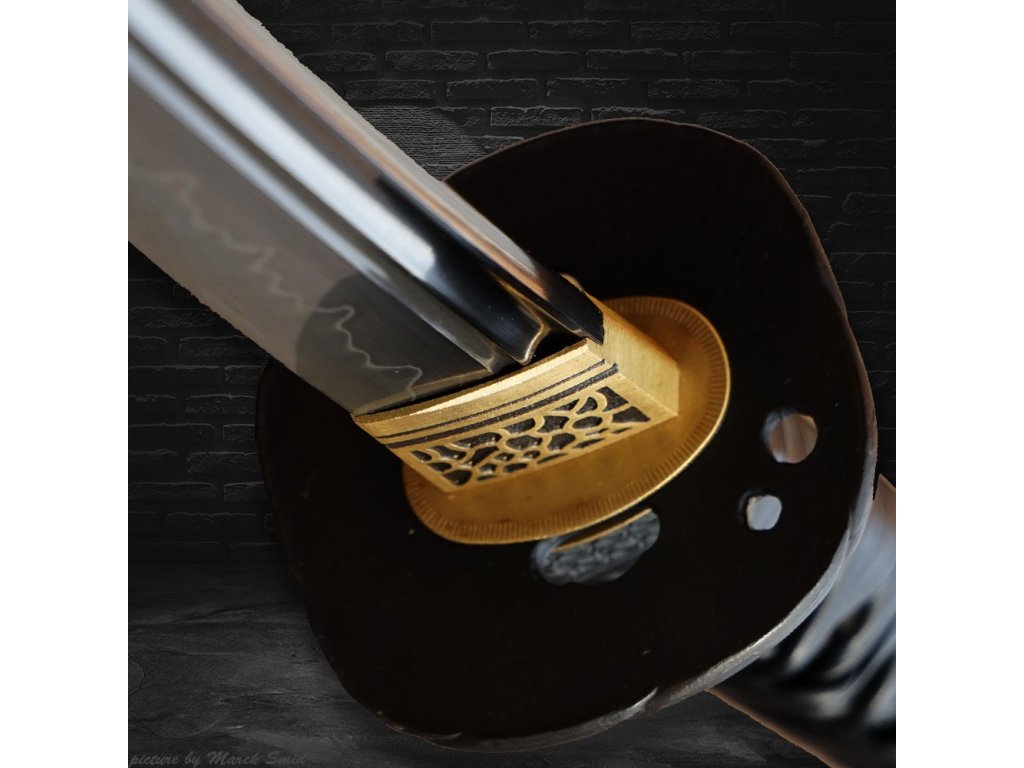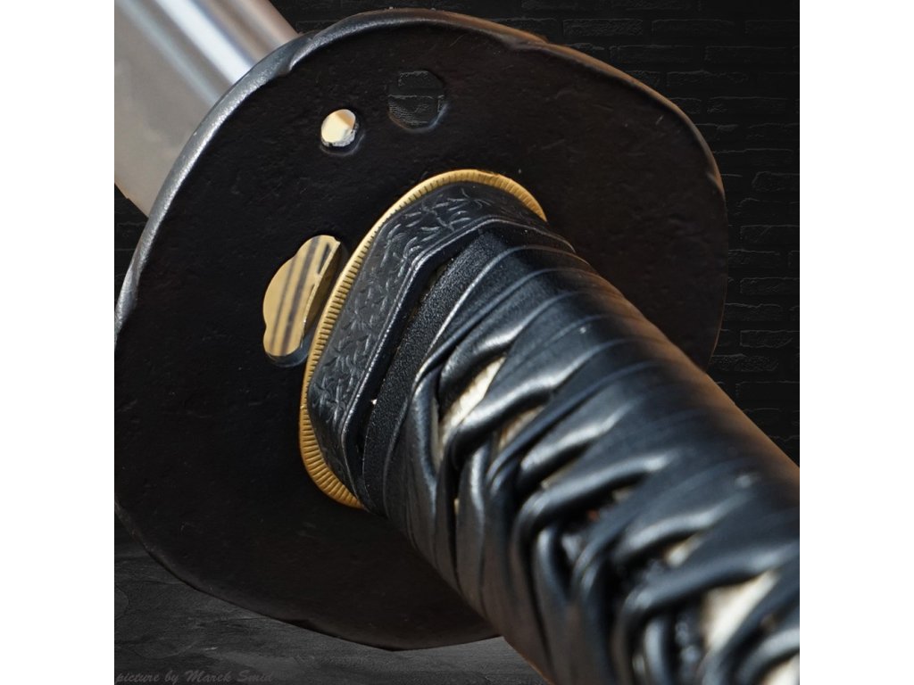 • Tsuka - dřevěné jádro, potažena pravou rejnočí kůží (Samegawa), s černou koženou omotávkou. Čepel zajištěna 2 bambusovými kolíky "mekugi"