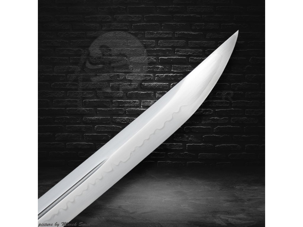 Kovaná čepel z oceli T-10 té nejvyšší kvality. Ocel byla laminována v monokompositní konfiguraci Maru - diferenciálně tvrzená. Uhlíková ocel T-10 (obsah 1,1% uhlíku a 0,4% manganu) je velmi pevná a skvěle drží ostrost. Čepel se žlábkem bo-hi byla ve finální fázi ručně leštěna kamenem hazuya - tím je dosaženo téměř žiletkového ostří (razor sharp) a zrcadlového lesku.