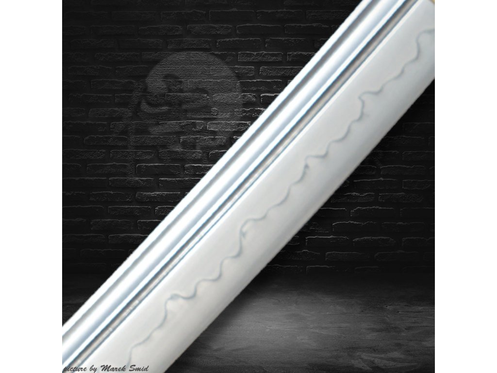 Výrazný reálný Choji Midare hamon je tvořen dle dávných tradičních metod, které vychází z mnohaletých zkušeností kovářského mistra, který výrobou této nádherné zbraně strávil několik dnů. Vše na tomto meči je individuálně zhotoveno, včetně saye a habaki, jsou použity nejkvalitnější komponenty, včetně špičkového laku na sayu, japonského hedvábí a skutečné rejnočí kůže nejvyšší kvality. Jedná se o špičkovou repliku samurajského meče, která je vhodná k sekovým zkouškám a lze ji rozložit na jednotlivé části. Tato čepel byla vyzkoušena a testována tak, aby odstranila vše co jí stojí v cestě ! Sori (zakřivení čepele) je speciálně navrženo tak, aby bylo dosaženo co možná nejjemnějších a nejčistších řezů. To vše v kombinaci s výběrem tradičního kovaného Koshirae zaručuje, že získáte to nejlepší z hlediska vzhledu i funkčnosti. Uhlíková ocel T-10 má působivou tvrdost HRC 58 - perfektní kombinace této tvrdosti je podtrženo zakřivením čepele Sori, které umožňuje snadné přeseknutí tatami, slaměné rohože, nebo bambusu pro tameshigiri. Full tang konstrukce této katany výrazně zvyšuje sílu meče. Čepel je typu shinogi-zukuri, tento typ čepele se vyrábí od 10.století našeho letopočtu. Tato katana (samurajský meč) je vhodná na použití v praxi, firma Dellinger se však zříká jakékoliv odpovědnosti za zranění a poškození vzniklá při použití. Schraňujte mimo dosah dětí ! Jakákoliv manipulace se samurajským mečem je na vaší vlastní odpovědnost. Nezapomeňte, že máte ve svých rukou smrtící zbraň !