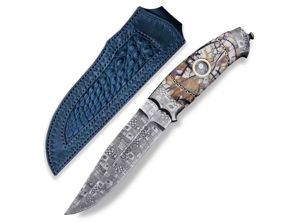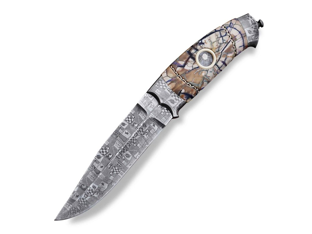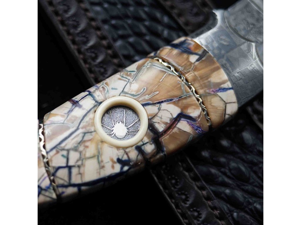 Exkluzivní lovecký nůž Dellinger Evil Spider Laminated Nr.02 z limitované edice nožů, s čepelí z laminované oceli a rukojetí z pravé fosilie mamutího klu. Precizní ruční výroba, extrémní ostrost 60 HRC a nezaměnitelný luxusní design dělají z tohoto nože unikátní sběratelský kousek s příběhem. Nůž je uložen ve stylové kožené pochvě.