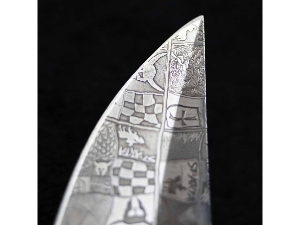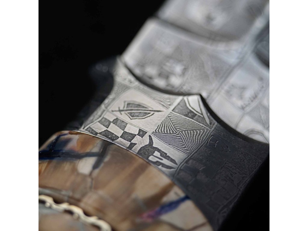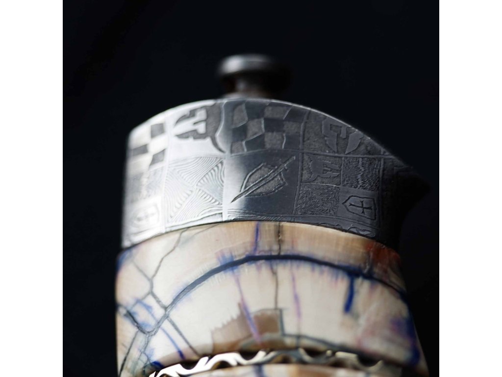 Jedná se o unikátní sběratelský nůž, ručně vyrobený s čepelí z laminované oceli. Každý nůž je ručně broušený a při použití této oceli o tvrdosti 60 HRC dosahuje mimořádné až extrémní ostrosti. Střenka (rukojeť nože) je broušená fosilie mamutího klu - zakončení a bolster taktéž zlaminované oceli. Mamutí fosilie klu a překrásná kresba laminované oceli tvoří perfektní pár - konečný výsledek je naprosto uchvacující.