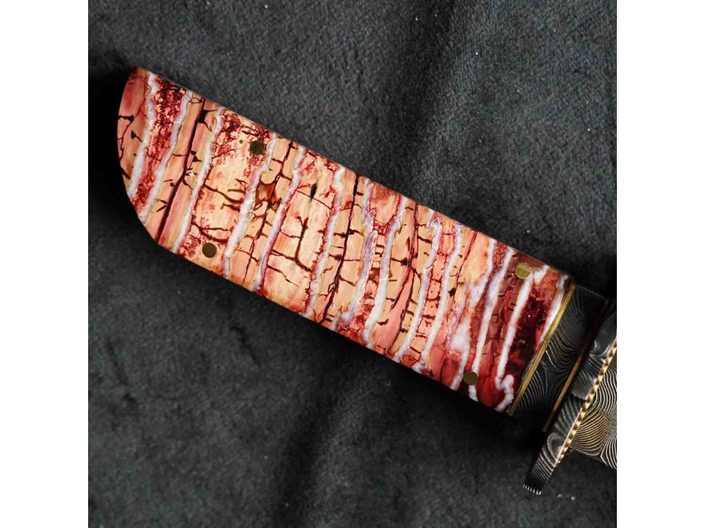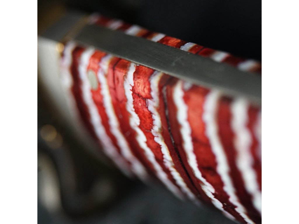 Sběratelský lovecký nůž tanto s krásnou čepelí z damaškové oceli Feather Damascus. Střenka z více než 10 000 let staré fosilie mamutího zubu dělá z každého kusu originál. Precizní ruční broušení zajišťuje extrémní ostrost. Luxusní sběratelský kousek v limitované sérii, včetně stylového koženého pouzdra. Nůž nr.10.