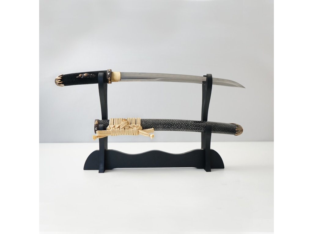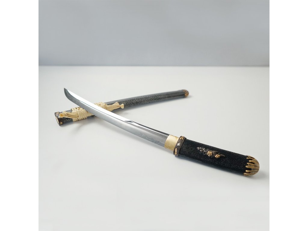Tsuka (rukojeť) | v provedení dashi zamé, t.j. potažena rejnočí kůží bez opletu (tsuka maki). Párové ornamenty menuki jsou s námětem snítky slivoně. |