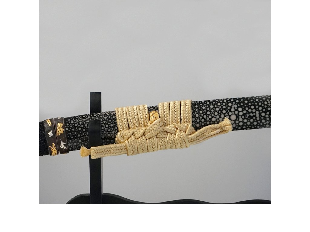 Saya (plášť) | potažena přelakovanou a přeleštěnou rejnočí kůží ve stylu nuri zamé. Oplet sage-o, kterým se meč fixuje k opasku obi, je barvy slonové kosti. |