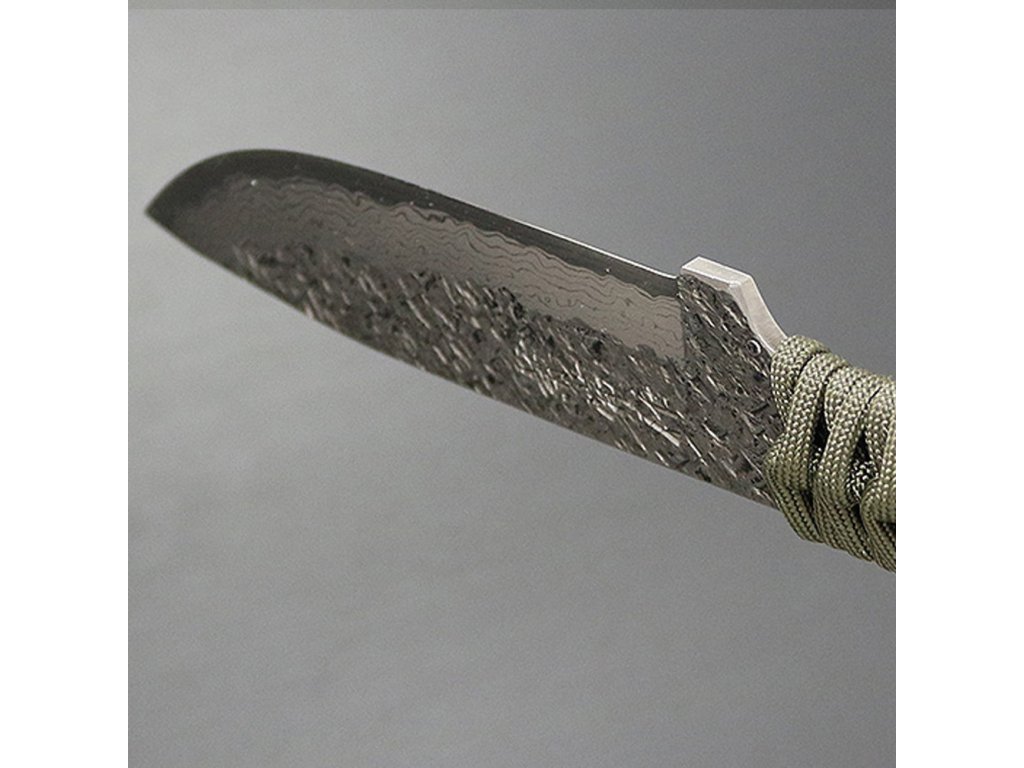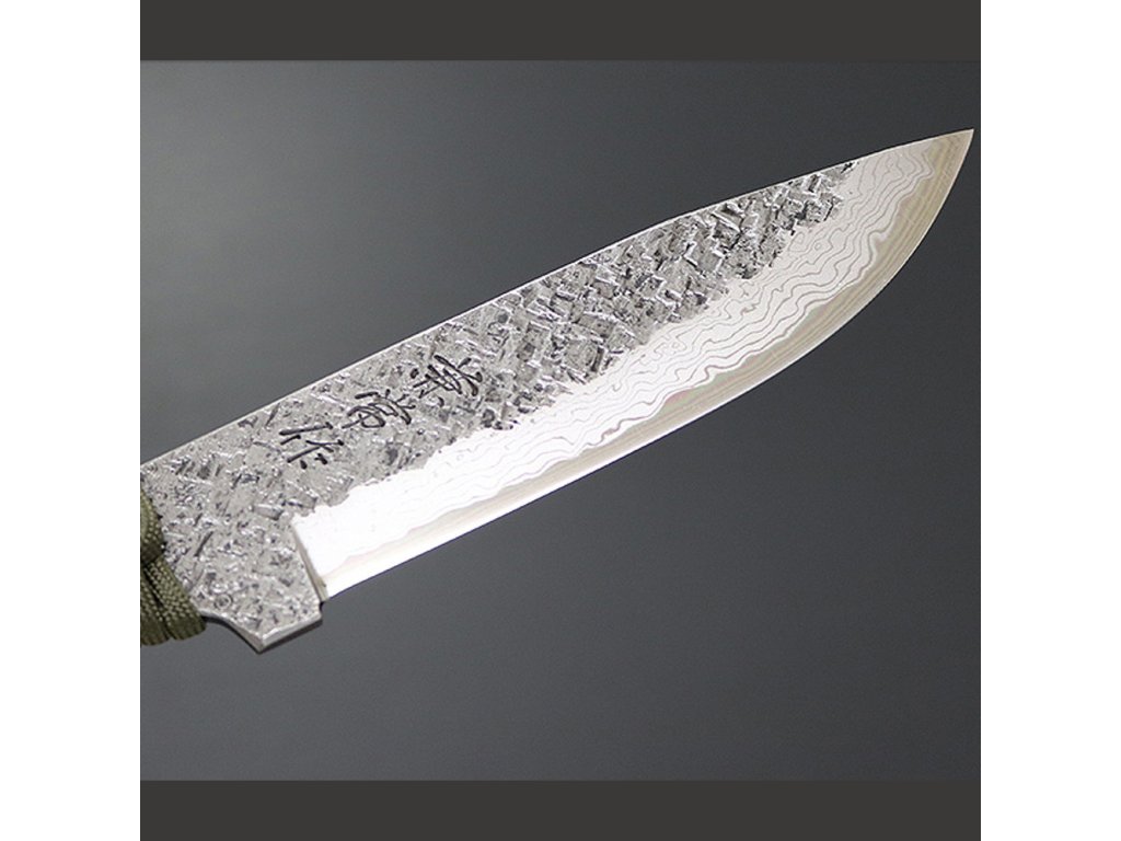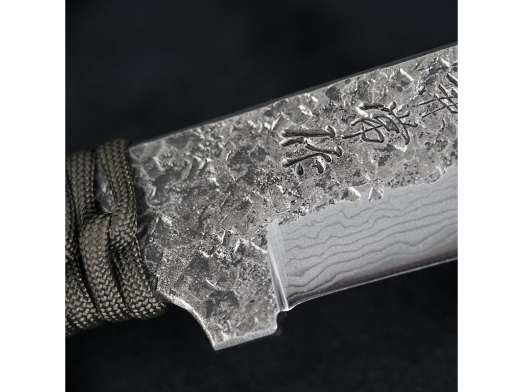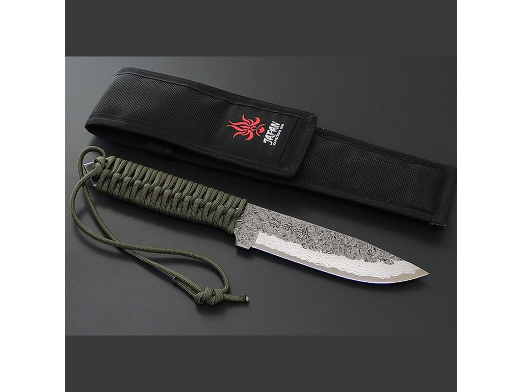 Bojový japonský survival nůž Kanetsune Karasu s čepelí z 15-vrstvé damaškové oceli Blue Steel #2. Tmavě zelený paracord, záchranářský hrot na rozbíjení skla a nylonové pouzdro. Vyrobeno v japonském Seki.