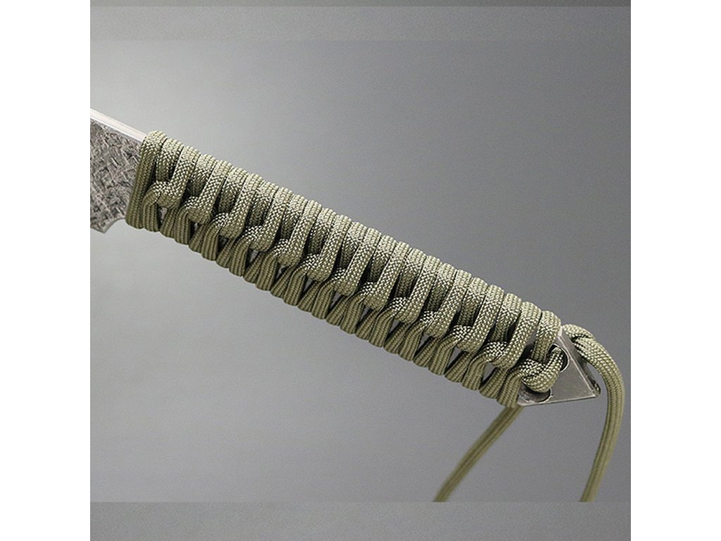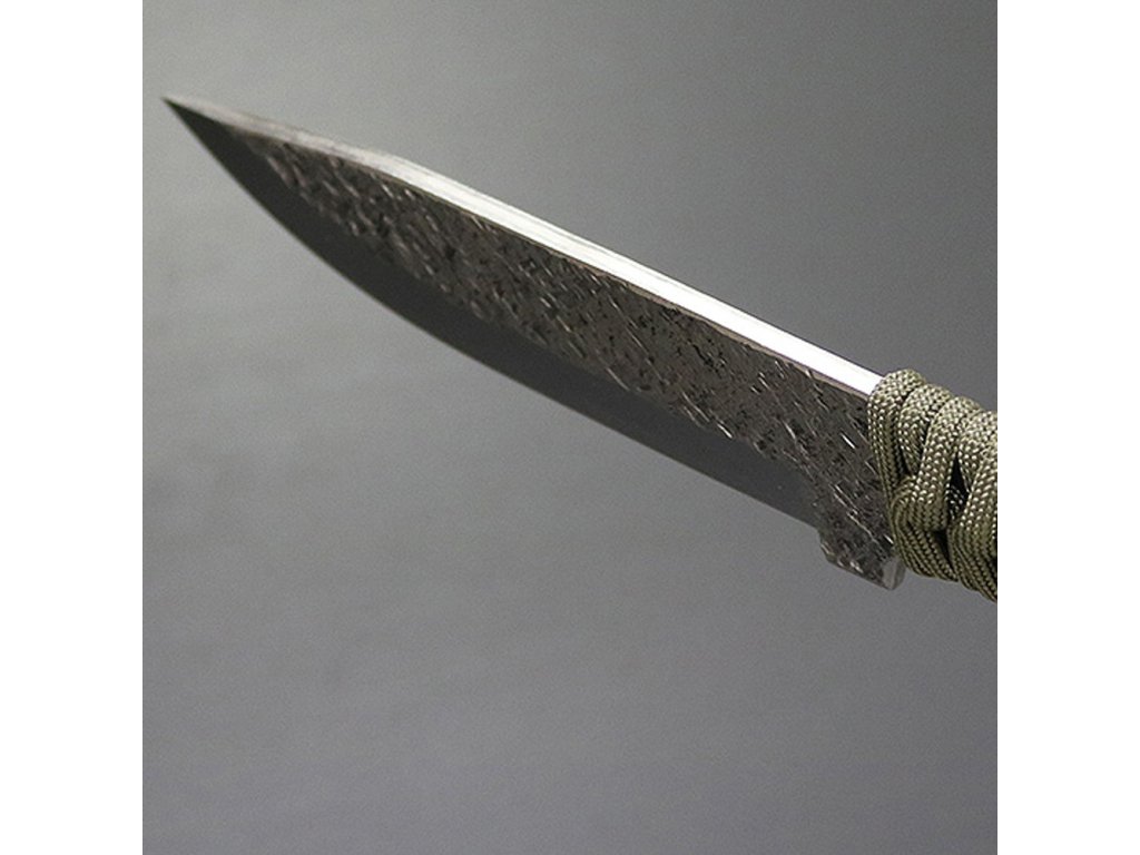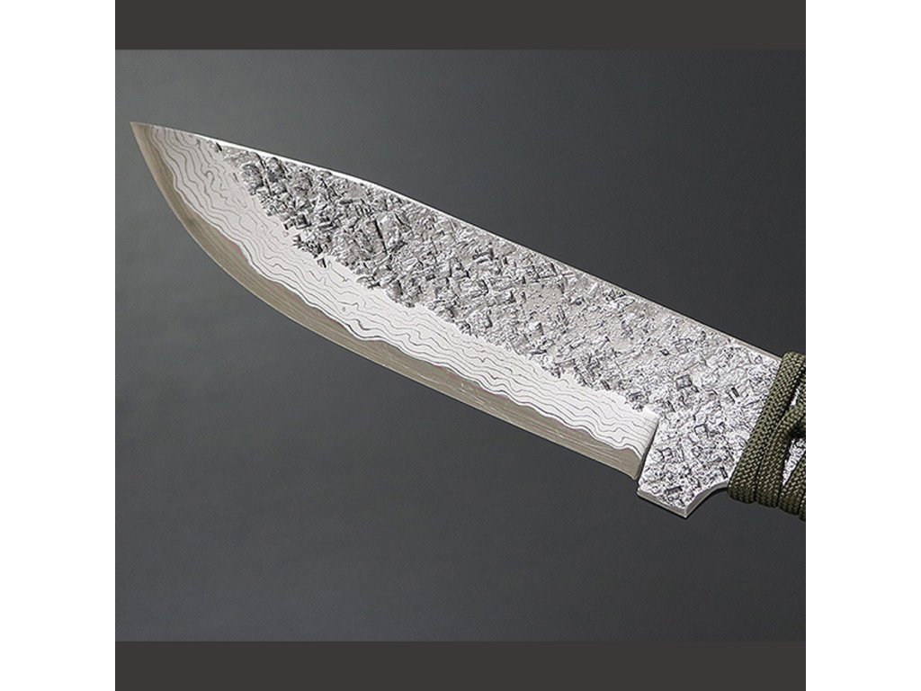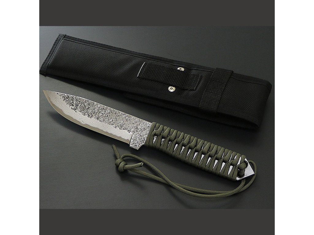 Bojový japonský survival nůž Kanetsune Karasu s čepelí z 15-vrstvé damaškové oceli Blue Steel #2. Tmavě zelený paracord, záchranářský hrot na rozbíjení skla a nylonové pouzdro. Vyrobeno v japonském Seki.