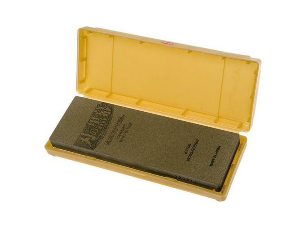 Brusný kámen ze série barevně odlišených japonských kamenů SHAPTON Kuromaku. Každá barva představuje jiný stupeň hrubosti dle japonské normy JIS. Praktické plastové pouzdro usnadňuje skladování a lze ho použít jako držák kamene při ostření. Hrubost kamene JIS #220, barva mechová. Rozměr kamene s podložkou 210x70x15 mm.