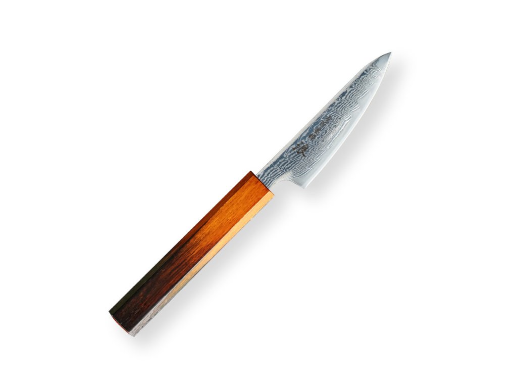 Univerzální nůž Petty/Utility ze série Hokiyama Sakon Bokusai ROU-Wave s ultra ostrým jádrem z japonské oceli AUS-10 vloženým mezi 32 vrstev měkčích ocelí - san mai clad. Oktagonová rukojeť je vyrobena z lakovaného dubového dřeva. Nůž je skvělý pomocník při čištění a krájení menšího ovoce, zeleniny, sýrů a dalších drobných potravin. Délka ostří 85 mm.