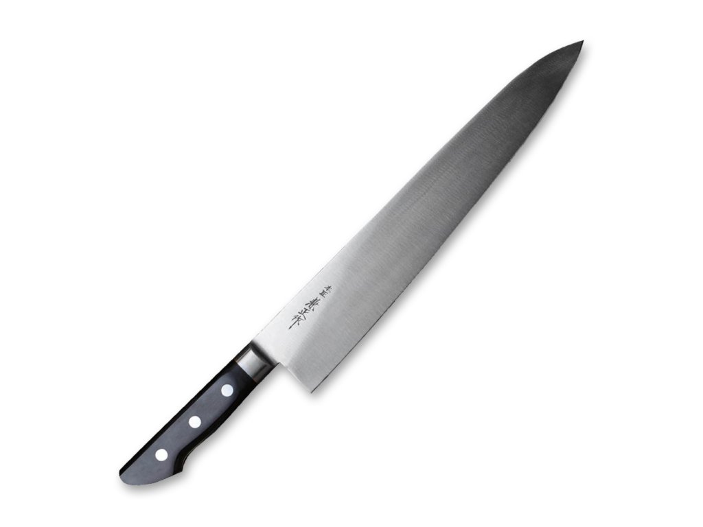 Japonský kuchyňský nůž Gyuto ze série Kanetsune Honsho Kanemasa E-series s čepelí z verginská uhlíkové oceli SK-95 , HRC 60-61. Klasická ergonomická západní rukojeť je vyrobena z černého Plywood, se třemi nýty. Délka ostří 300 mm.