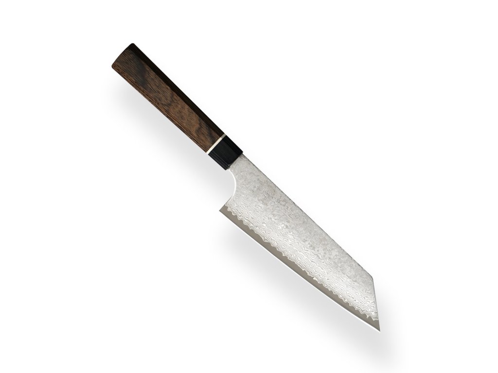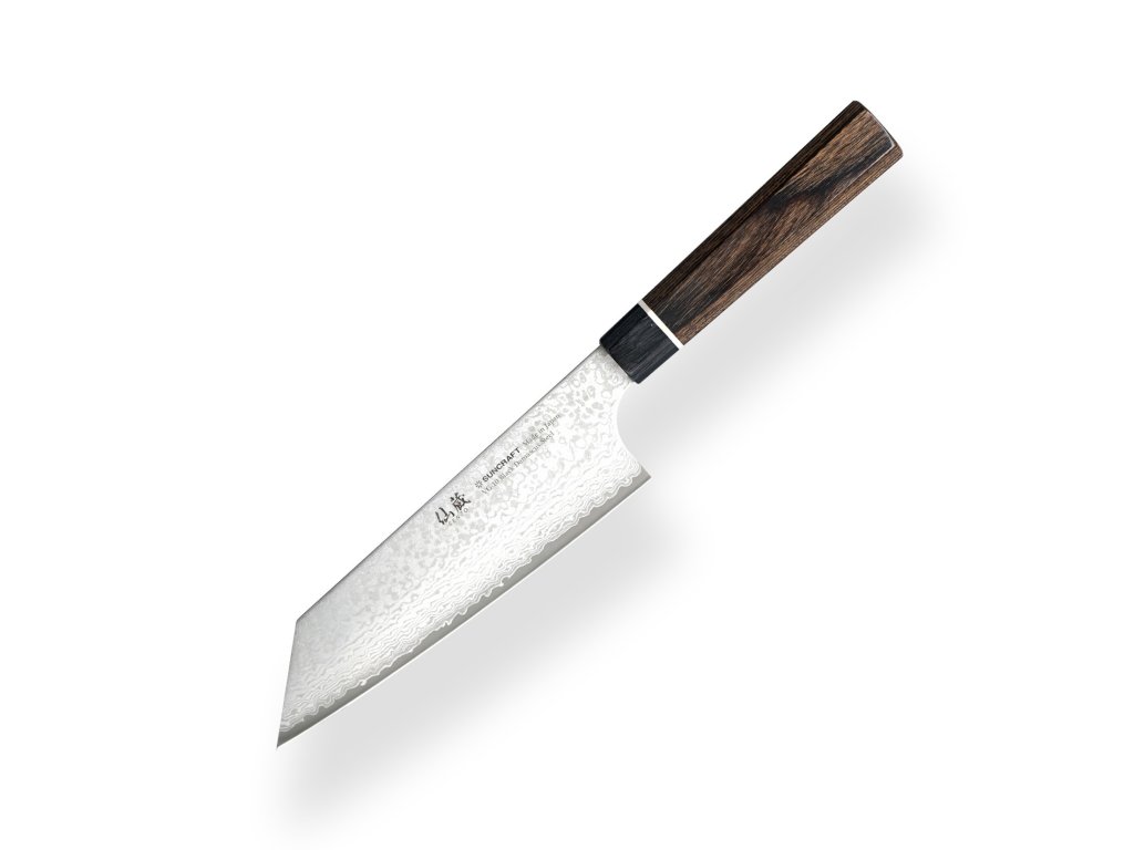 Japonský kuchyňský nůž Bunka ze série Suncraft VG-10 Black Damascus s jádrem z oceli VG-10 vloženým mezi 66 vrstev nerezových damaškových ocelí a rukojetí z materiálu Pakka-wood se stylovým bílým kroužkem. Extrémně ostrý kuchyňský nůž určený pro práci s masem, rybami, zeleninou a ovocem. Délka ostří 165 mm.