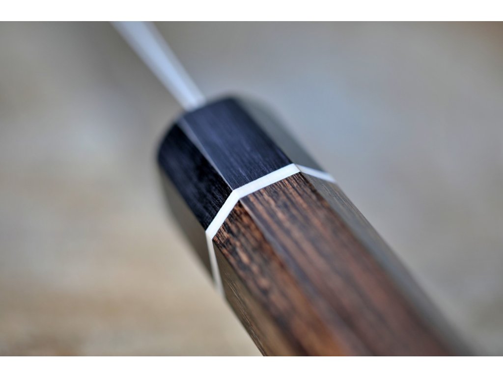 Octagonová rukojeť asijského stylu je vyrobena z materiálu Pakka-wood a je ozdobena stylovým bílým kroužkem. Vždy je pečlivě ručně leštěná, ergonomicky tvarovaná a navržena pro vynikající ruční ovládání. Materiál Pakawood je voděodolný a zcela bez zápachu. Můžete si být jisti, že tento materiál nebude v průběhu času korodovat, oxidovat nebo se nestane měkčí a křehčí. Tento materiál nevyžaduje prakticky žádnou údržbu, na rozdíl od tradičních materiálů jako je dřevo. Krásná, tmavě hnědá, osmiúhelníková dřevěná rukojeť dobře sedí ve Vaší ruce a je jedno zda jste pravák, nebo levák. Dřevo Pakka je směsí vrstveného dřeva a epoxidové pryskyřice.