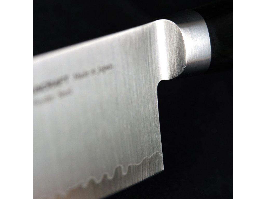 Jádro nože je z oceli SG2 (super gold 2), známé také jako R2 nebo SRS-2, která byla vyvinuta v Japonsku. Tato ocel patří mezi tzv. práškové oceli, což znamená, že je vyrobena z jemně mletého prášku železa a uhlíku. SG2 je považována za jednu z nejlepších ocelí pro výrobu nožů na světě. Ocel SG2 je známá svou vynikající kombinací tvrdosti, odolnosti proti opotřebení a korozní odolnosti. Obsahuje přibližně 1,3 % uhlíku, což jí poskytuje vysokou tvrdost a zároveň zachovává dostatečnou pružnost. Ocel SG2 je legovaná přísadami jako chrom, molybden a vanad, které přispívají k jejímu vylepšenému výkonu. Nože vyrobené z oceli SG2 jsou obvykle ručně kované a mají vynikající ostří. Díky vysoké tvrdosti oceli je možné dosáhnout dlouhodobého udržení ostrosti, což je důležité pro každodenní používání nože. Tato ocel je také dobře odolná proti korozi, což znamená, že nože z SG2 jsou snadno udržovatelné a odolné vůči vlivům vlhkosti. Japonská ocel SG2 je oblíbená mezi profesionálními kuchaři. Její vysoká kvalita, výkon a estetická hodnota ji činí atraktivní volbou pro ty, kteří oceňují kvalitní nože. Nože vyrobené z oceli SG2 jsou obvykle dražší kvůli použití této vysoce kvalitní oceli a mnohdy ručnímu zpracování. Na obou stranách čepele je použita nerezová ocel odolná proti korozi. Výsledkem je krásný vlnovitý vzor (hamon) na ostří čepele, podobný jako u japonského samurajského meče.