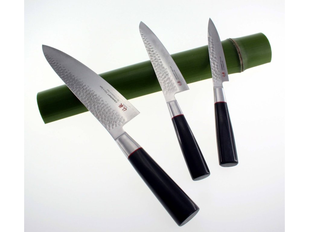 Nože Suncraft Senzo Classic Tsuchime Damascus jsou o něco těžší než standardní japonské nože. Přidaná hmotnost je výsledkem kování čepeli za studena. Obvyklá síla polotovaru před lisováním je 4 mm. Tímto procesem, který se nazývá Tsuchime (kladívkový povrch) získává nůž nejen skvělý vzhled, ale také zabraňuje přilepení krájeného materiálu k čepeli.
