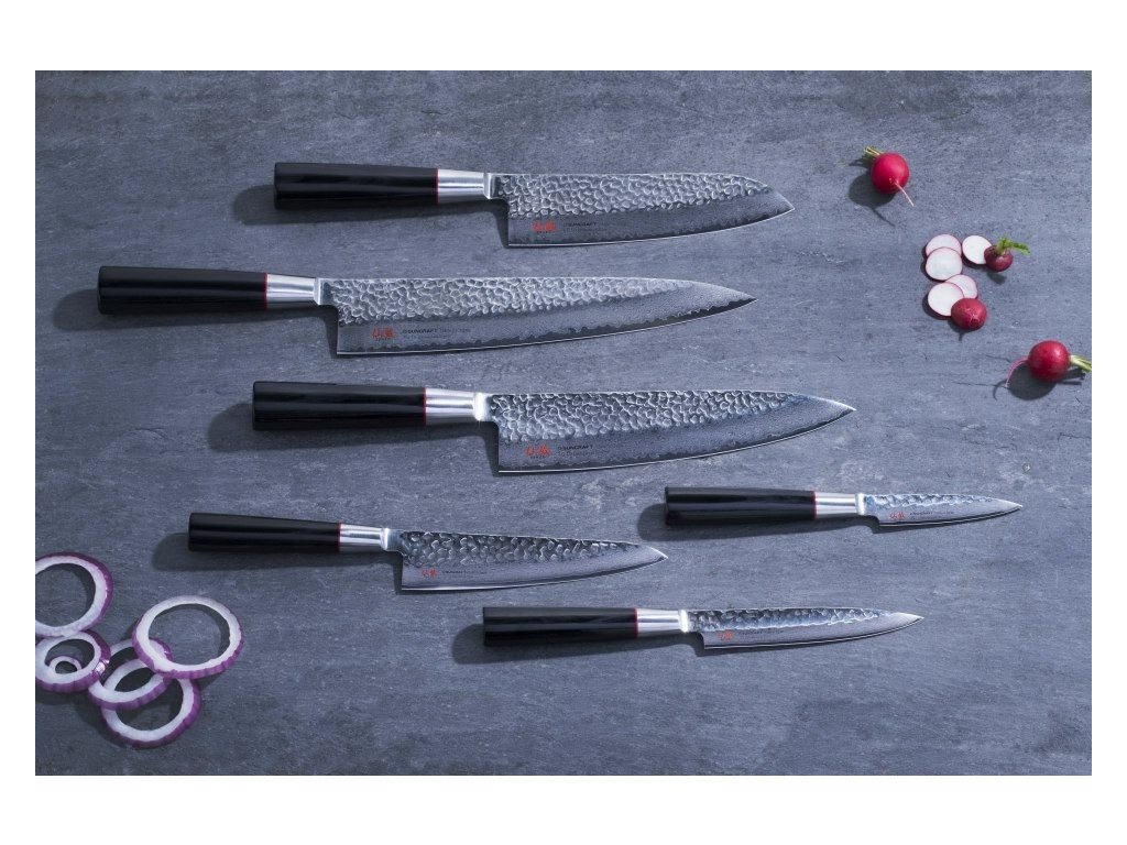 Japonský kuchyňský nůž Chef/Gyuto ze série Suncraft Senzo Classic Damascus s ultra ostrým řezným jádrem z japonské oceli VG10, vloženým z každé strany mezi 16 vrstev měkké damaškové oceli, s povrchovou úpravou Tsuchime (kladívkový povrch). Západní ergonomická rukojeť je vyrobena z materiálu Pakka-wood. Čepel je od rukojeti oddělena červeným tepelně odolným kroužkem. Tento nůž je určen pro krájení a čištění masa, ovoce a zeleniny. Je též vhodný ke kolébkovému krájení bylinek. Délka ostří 240 mm.