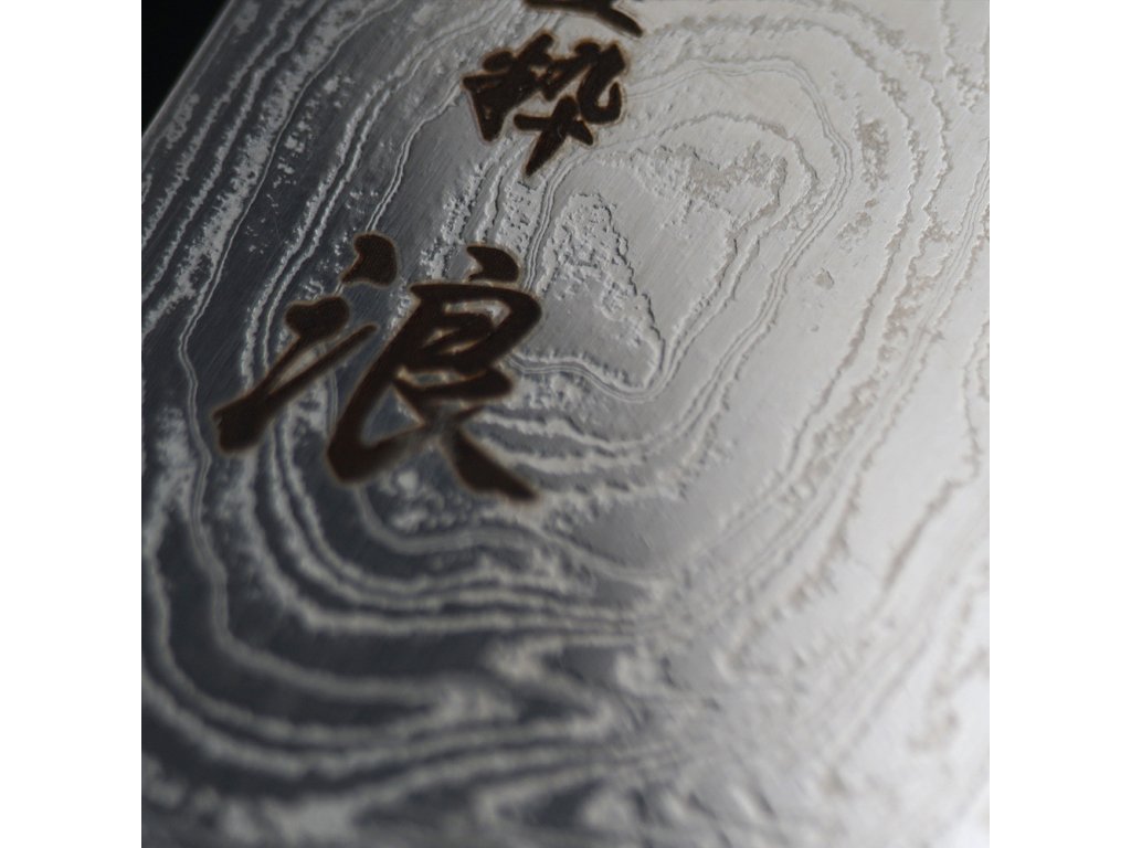 Damaškové nože Hokiyama Sakon Bokusui ROU-Wave s velmi výrazným 32-vrstvým damaškovým vzorem, který obohacuje vizuální stránku čepele - tento vzor je u každého nože jedinečný a nelze jej napodobit. Damaškový vzor je zčásti oblý a zčásti zakřivený, odtud název vířivý damašek. Stejně jako otisk prstu, ani jedna čepel není stejná. Celá čepel je vyleštěna do zrcadlového lesku. Můžete se v ní vidět! Na samém okraji si lze všimnout výrazné, křivkové linie (matný povrch), která se táhne po celé délce čepele. Jedná se o linii mezi jádrem a 32 měkčími, vnějšími vrstvami oceli, které slouží jako dodatečná ochrana ocelového jádra. Takovému sendviči tvrdší oceli jádra a měkčí vnější oceli se říká san-mai clad. Tímto způsobem se vyrábí většina dnešních japonských nožů.
