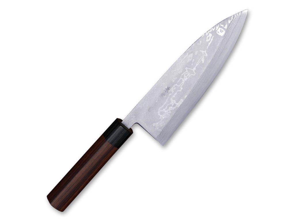 Japonský nůž šéfkuchaře Deba ze série KC-400 Series s jádrem z oceli White steel #2, HRC 60-61, vložené mezi 11 vrstev. Rukojeť ve tvaru písmene "D" je vyrobena z červeného santalového dřeva, bolster z černého dřeva Plywood. Délka ostří 210 mm.