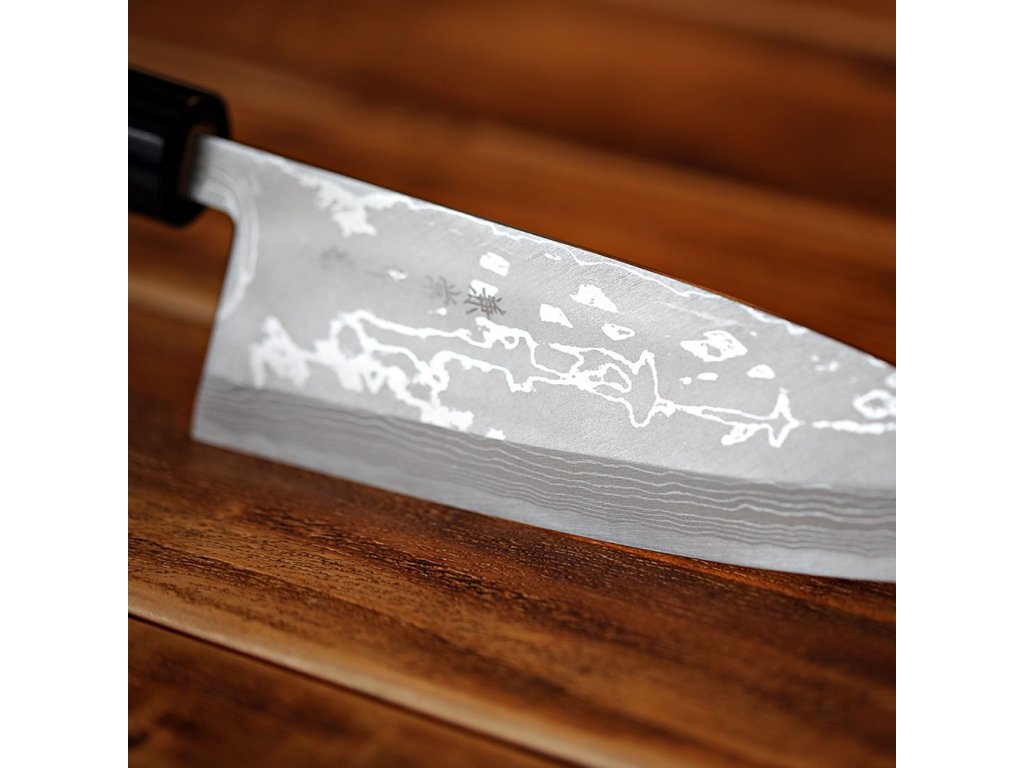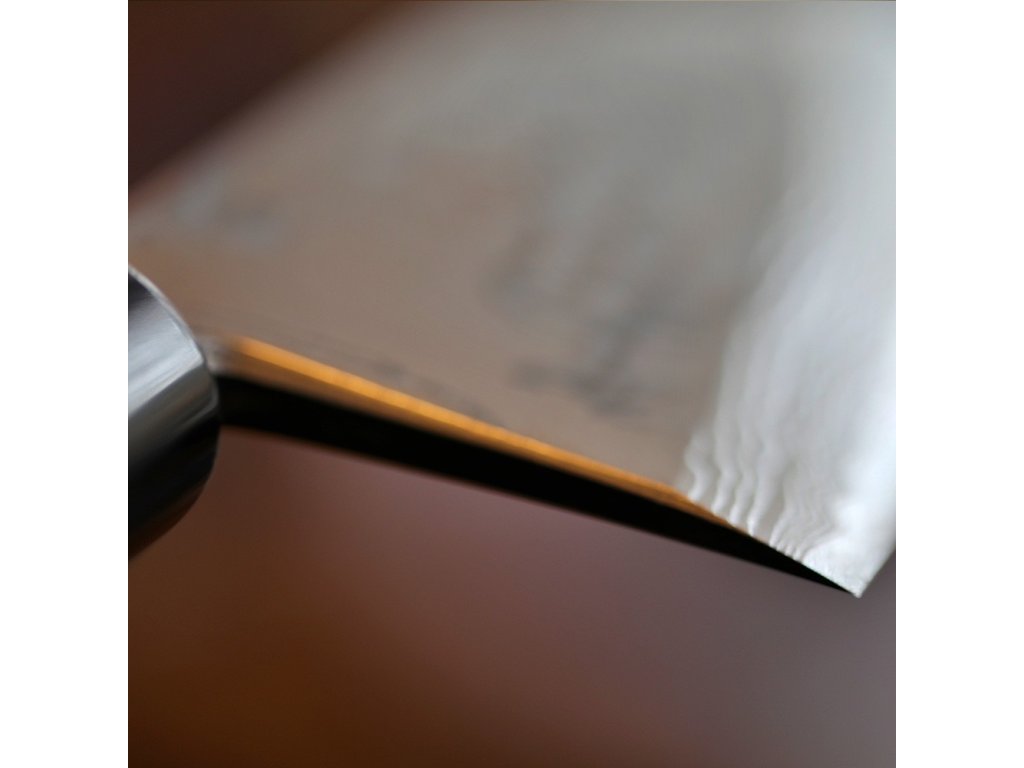 Jádro čepele těchto nožů je kované z vysoce uhlíkové oceli White Steel #2. Tato ocel díky tomu, že je legovaná chromem a wolframem, má vynikající retenci ostří a odolnost. Je velmi oblíbená u japonských výrobců nožů. Tvrdost nože je 60-61 HRC. Nádherná damašková čepel je složená z 11 vrstev a mimořádně ostrého řezného jádra. Čepel je osazena tradiční japonskou rukojetí ve tvaru písmene „D“ z červeného santalového dřeva, bolster je z černého dřeva Plywood.