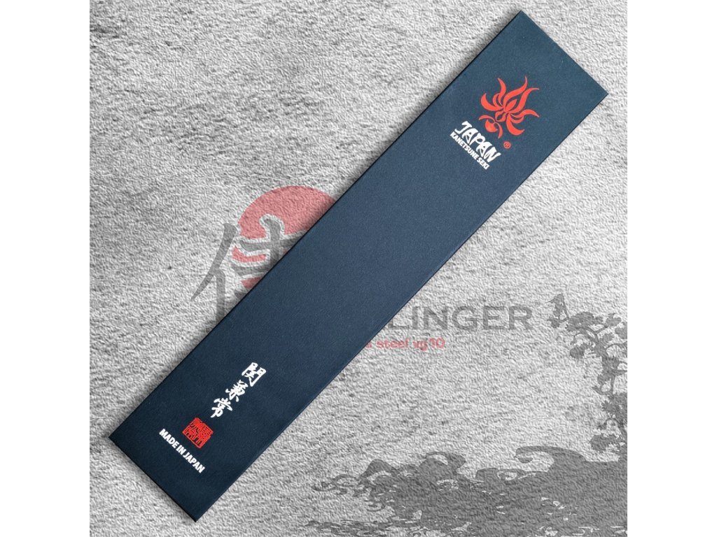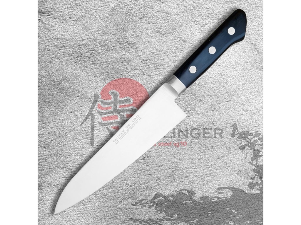 Velmi ostrý nůž šéfkuchaře Gyuto ze série Kanetsune AUS 10 PRO series. Čepel je vyrobena z kvalitní japonské nerezové oceli AUS-10, která obsahuje 0,95 - 1,10% uhlíku a dobře vyvážené složení molybudenu, vanadu a dalších legur. Tato nerezová ocel má vynikající odolnost proti korozi a houževnatost, tvrdost je HRC 59-60. Základní a jednoduchá rukojeť z materiálu Plywood má vynikající přilnavost a vysokou odolnost proti opotřebení. Fulltangová konstrukce (čepel nože prochází celým nožem a rukojeť je pronýtována 3 nýty) zaručuje celkovou konstrukční pevnost.
