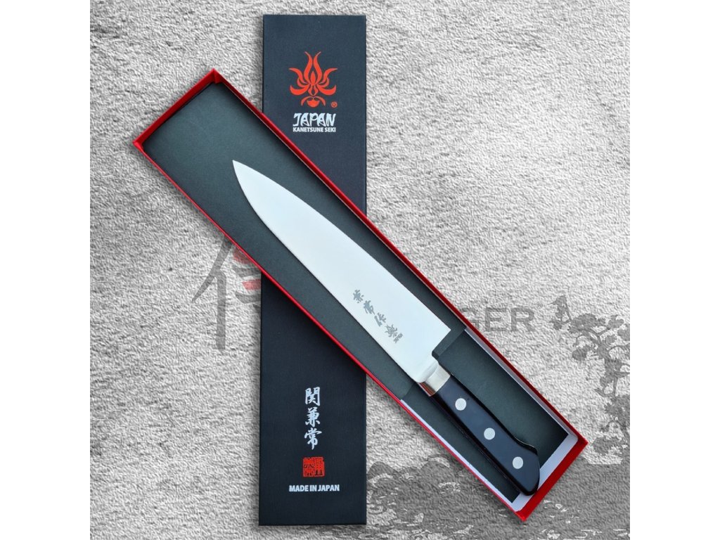 Japonský nůž šéfkuchaře Gyuto ze série Kanetsune AUS-10 PRO Series s čepelí z kvalitní japonské nerezové oceli AUS-10 HRC 59-60. Klasická rukojeť z Plywood se třemi nýty. Délka ostří 240 mm.