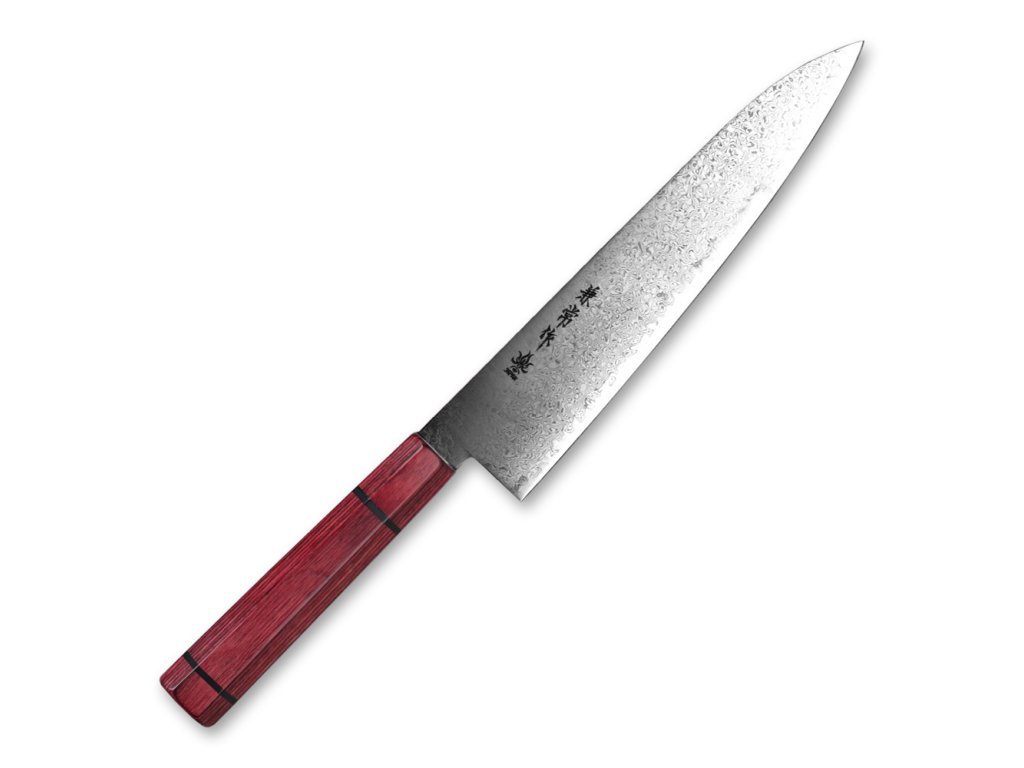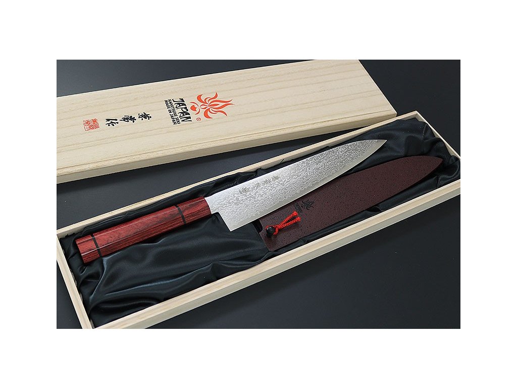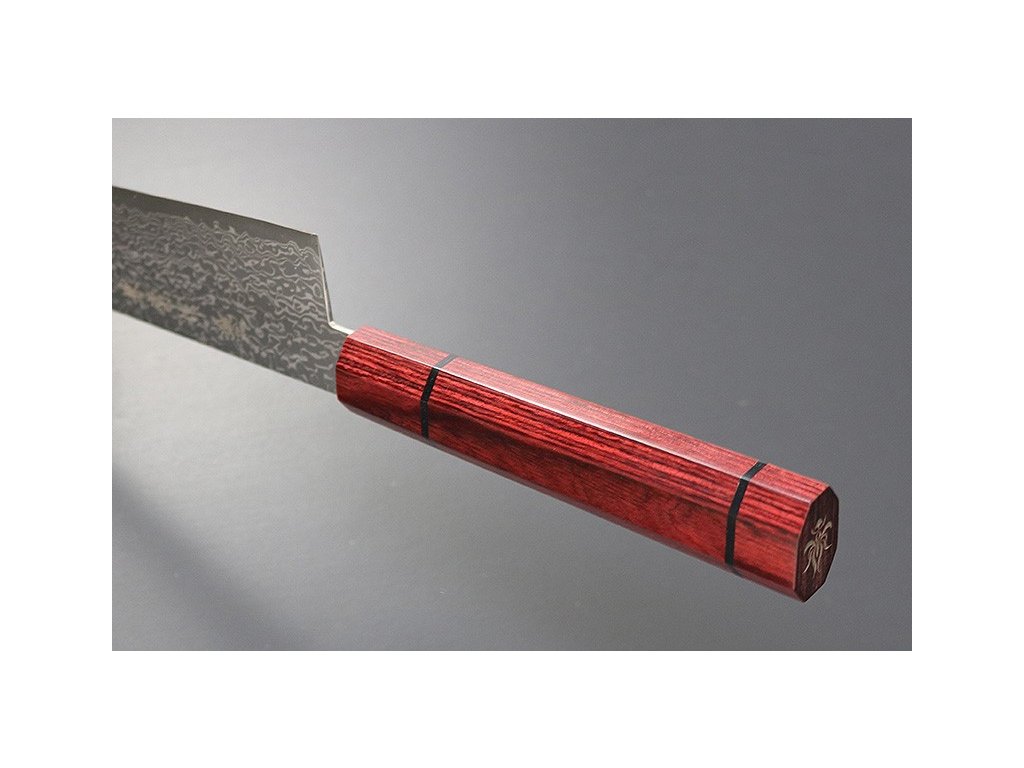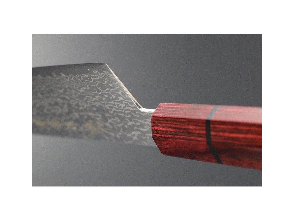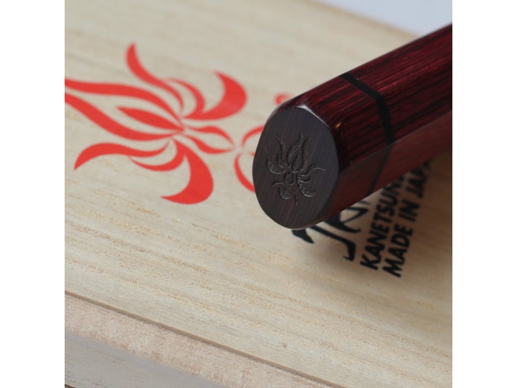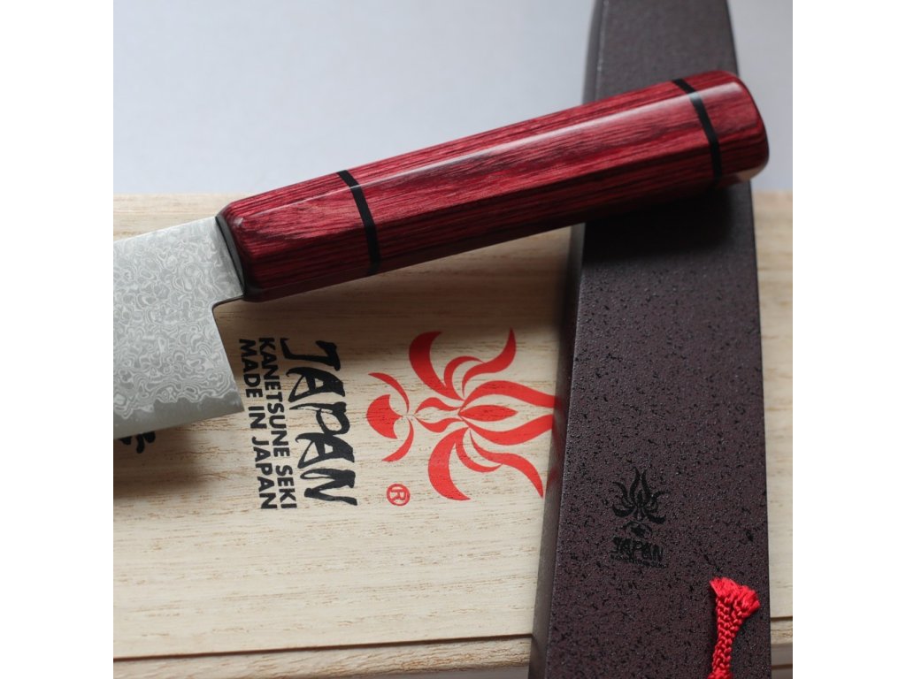 Japonský nůž šéfkuchaře Gyuto/Chef ze série Kanetsune Damascus Minamo-Kaze series. Čepel nože je složena ze 63 vrstev damaškové oceli s jádrem z oceli s vysokým obsahem uhlíku o tvrdosti HRC 61 ± 0,5. Japonská tradiční oktagonová rukojeť z červeného Plywood, doplněna černou mikartou. Luxusní dřevěná krabice, japonská saya ze dřeva magnólie. Délka ostří 210 mm.