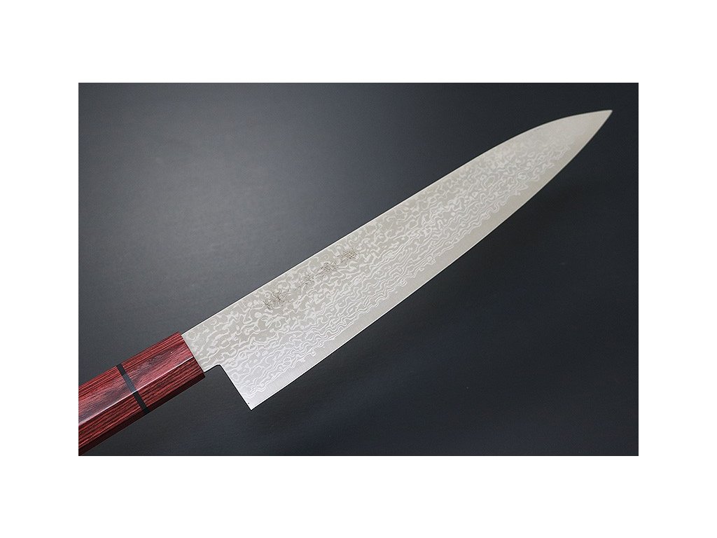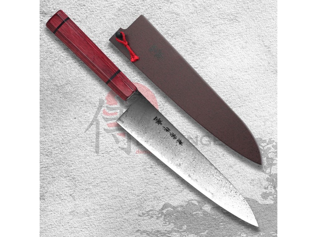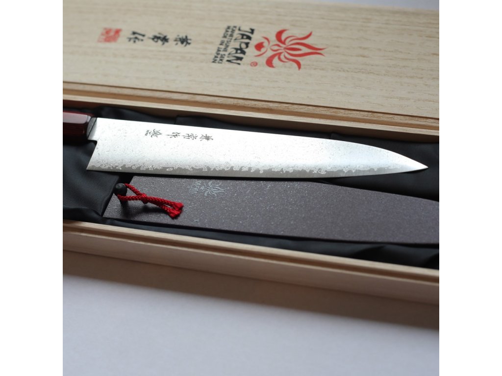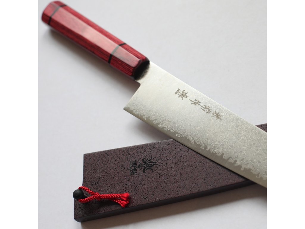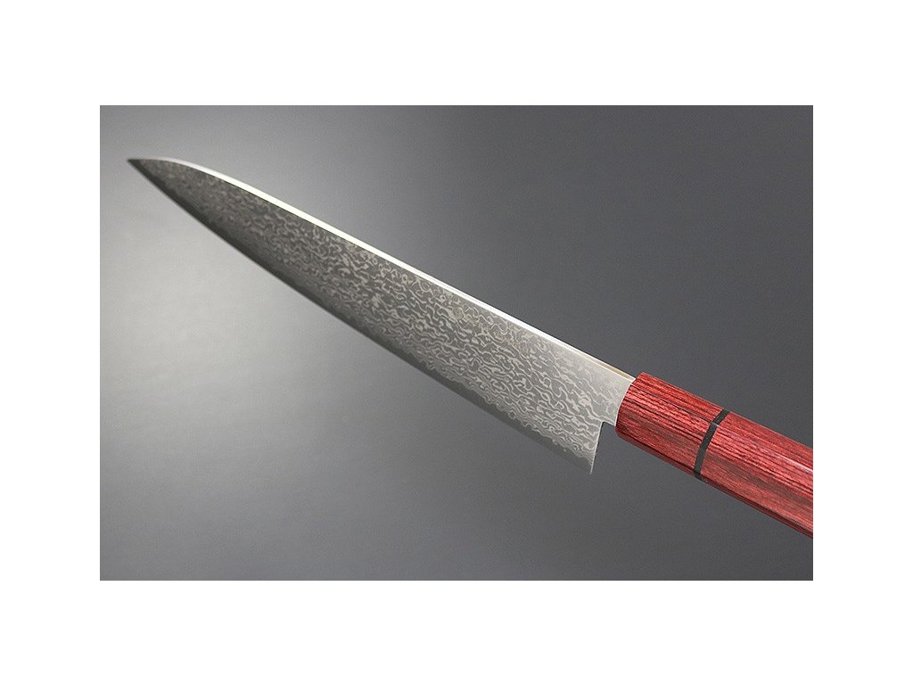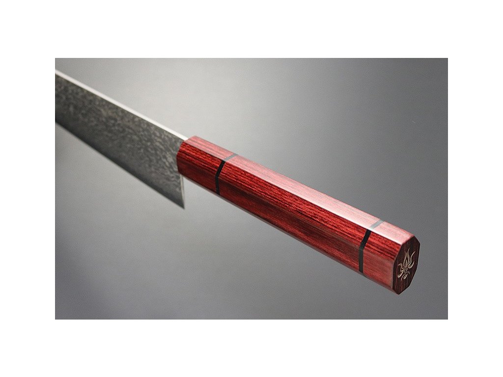 Japonský nůž šéfkuchaře Gyuto/Chef ze série Kanetsune Damascus Minamo-Kaze series. Čepel nože je složena ze 63 vrstev damaškové oceli s jádrem z oceli s vysokým obsahem uhlíku o tvrdosti HRC 61 ± 0,5. Japonská tradiční oktagonová rukojeť z červeného Plywood, doplněna černou mikartou. Luxusní dřevěná krabice, japonská saya ze dřeva magnólie. Délka ostří 210 mm.