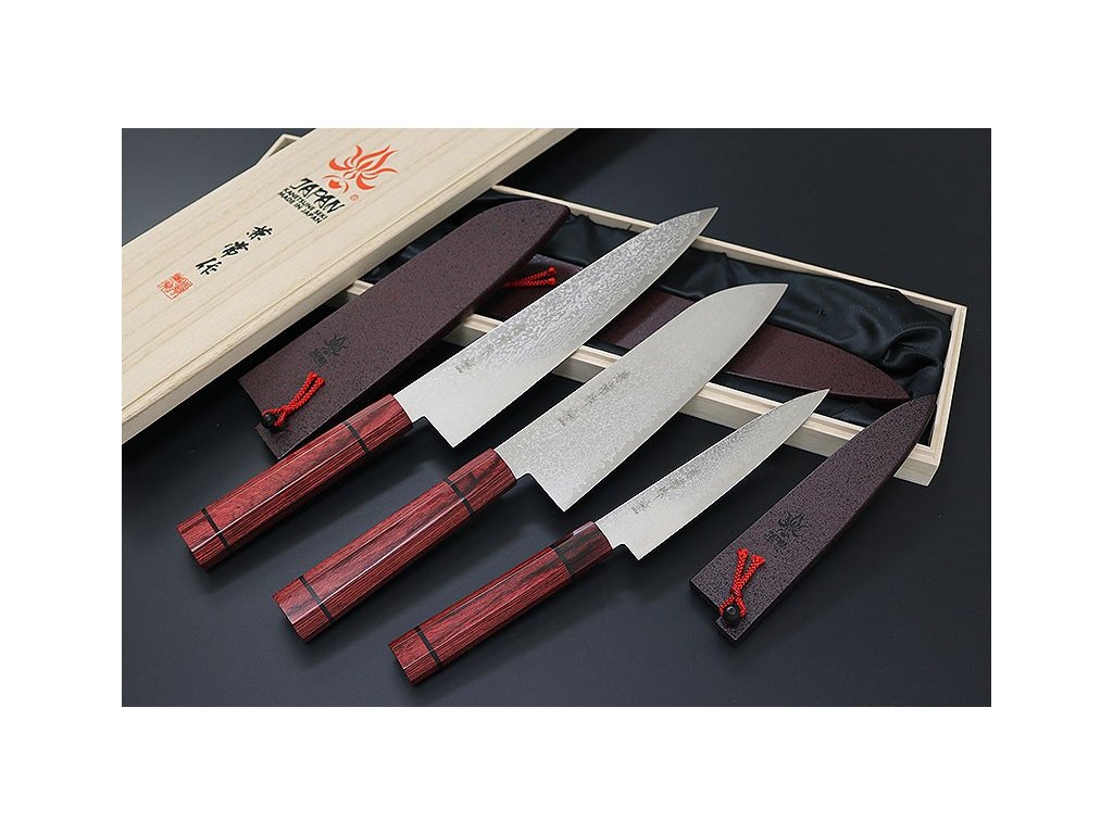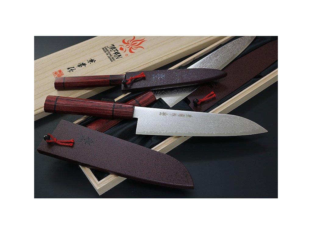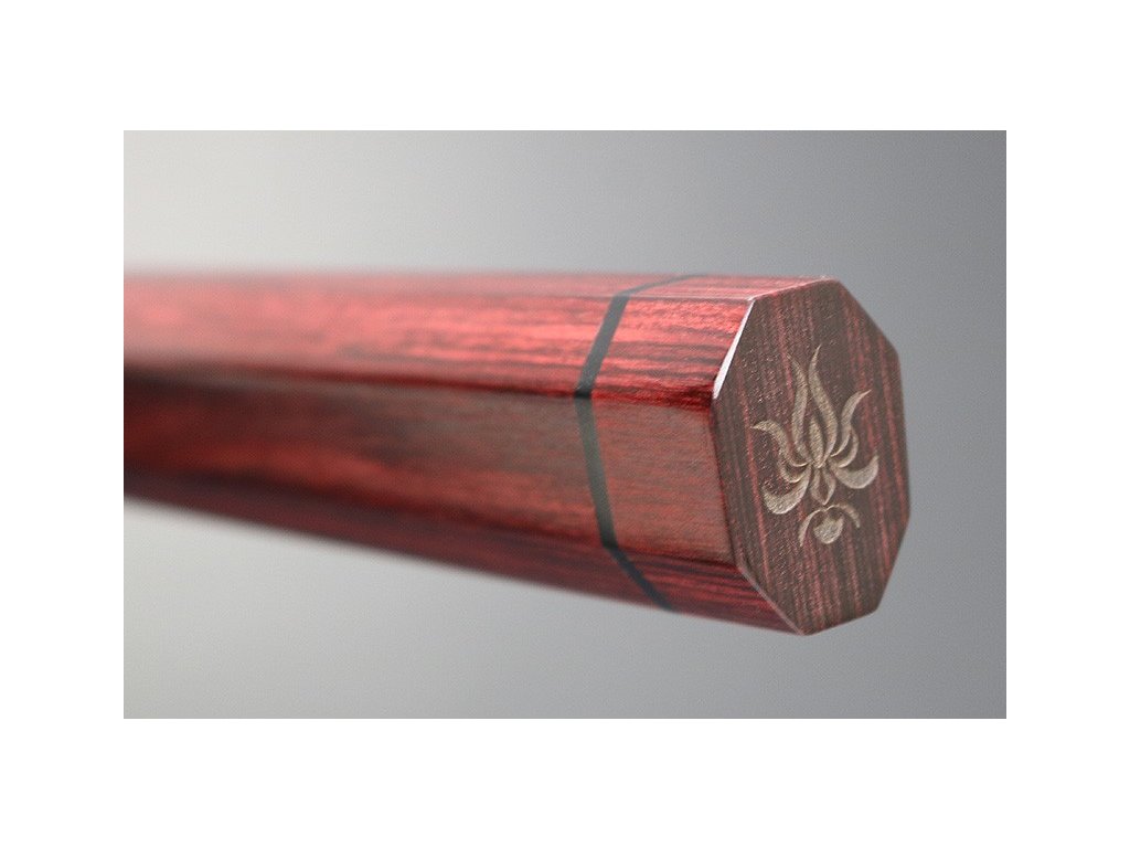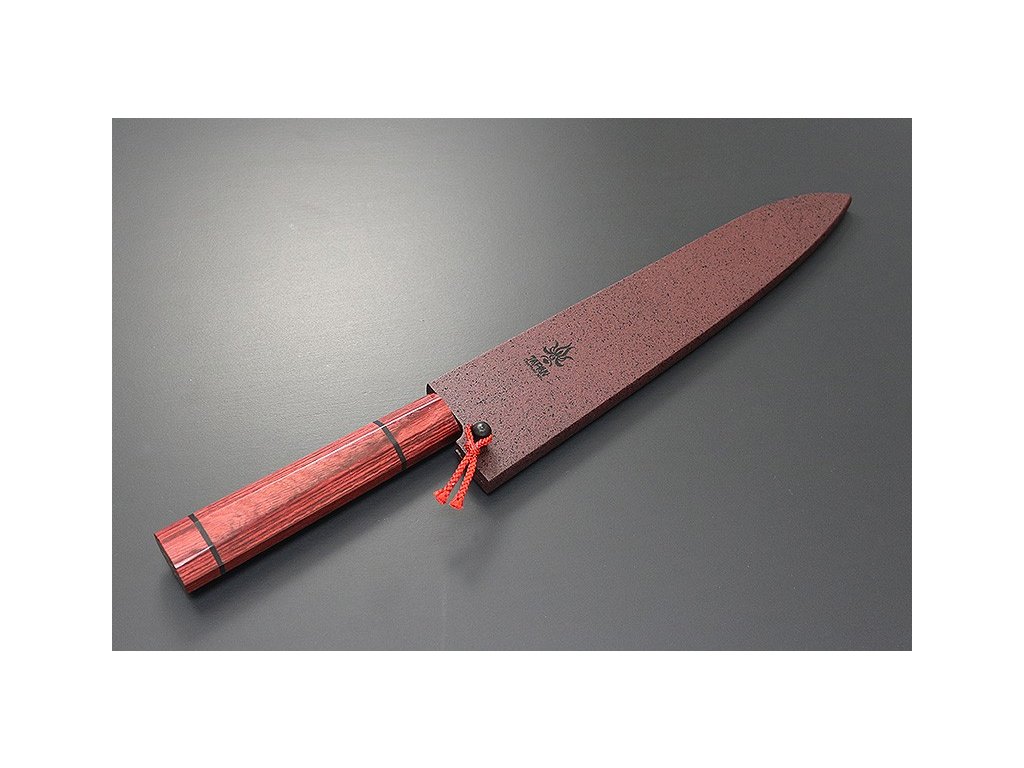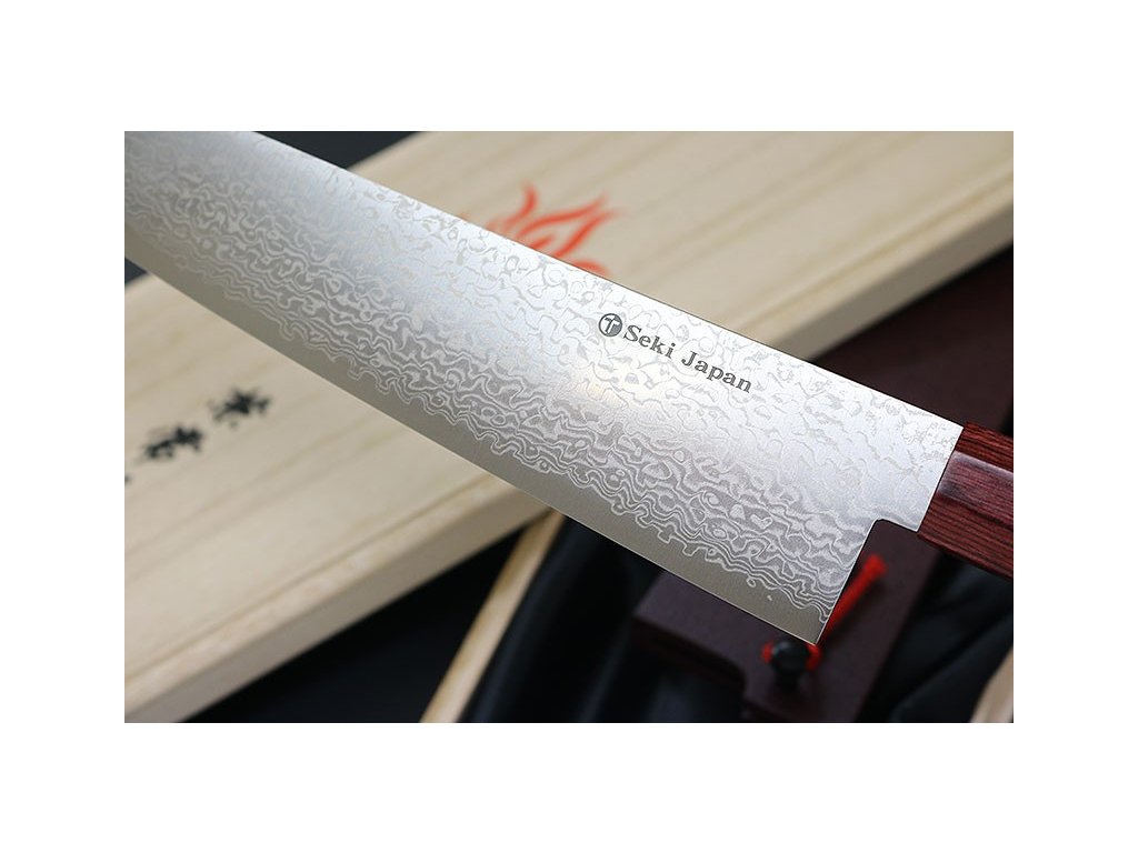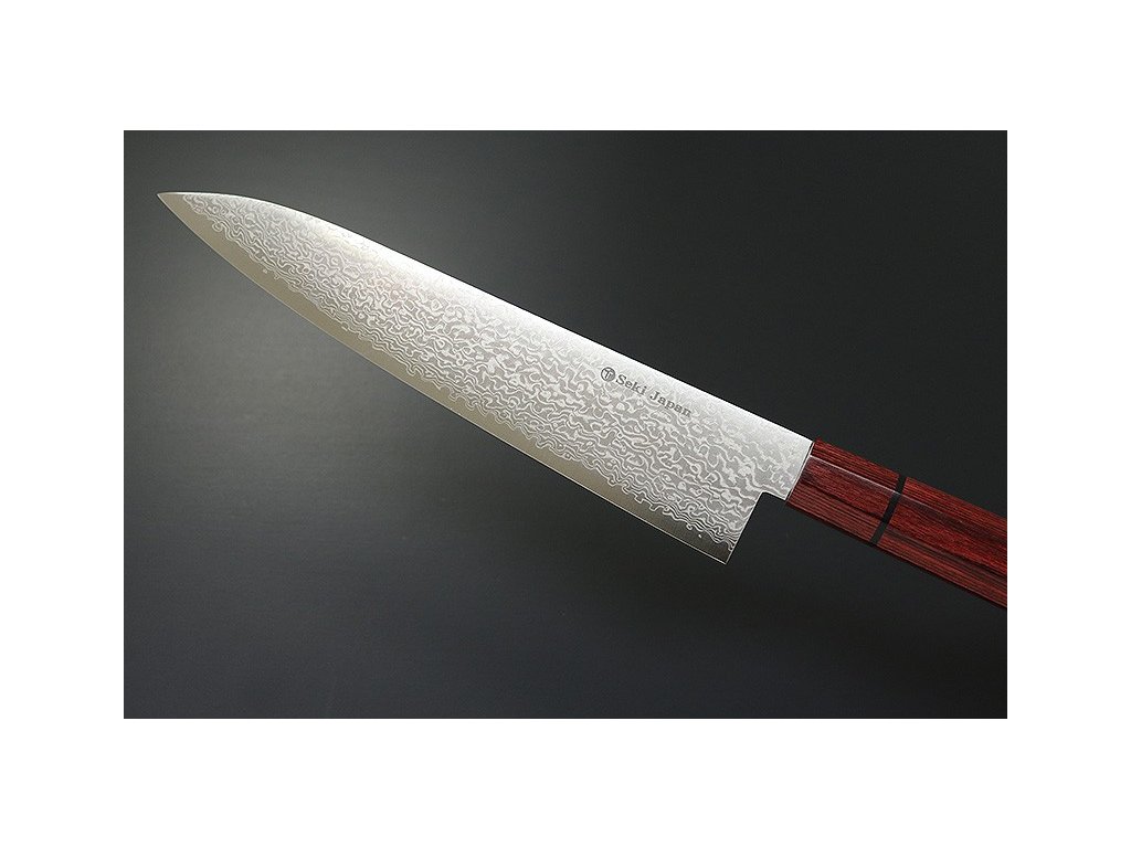 Japonský nůž šéfkuchaře Gyuto/Chef ze série Kanetsune Damascus Minamo-Kaze series. Čepel nože je složena ze 63 vrstev damaškové oceli s jádrem z oceli s vysokým obsahem uhlíku o tvrdosti HRC 61 ± 0,5. Japonská tradiční oktagonová rukojeť z červeného Plywood, doplněna černou mikartou. Luxusní dřevěná krabice, japonská saya ze dřeva magnólie. Délka ostří 210 mm.
