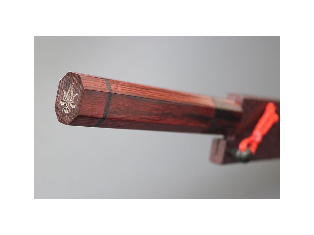 V českém překladu to znamená „odraz na vodní hladině“. A když se zadíváte na atraktivní damaškovou čepel, tak skutečně vypadá jako odraz paprsků na vodní hladině. Je složena ze 63 vrstev damaškové oceli s jádrem z oceli s vysokým obsahem uhlíku o tvrdosti HRC 61 ± 0,5. Japonská tradiční oktagonová rukojeť „八角 柄“ je vyrobena z červeného dřeva Plywood a je vkusně doplněna černými proužky z micarty, na konci rukojeti je vyrytý znak Kanetsune. Způsob uchycení čepele rukojeti Etsuke je zde tzv. naražení na trn, kdy se čepel zahřeje a narazí se do rukojeti. Tento nůž je dodáván v luxusní dřevěné krabici s japonskou sayou (dřevěný kryt na čepel), který je vyroben ze dřeva magnolie s tradiční povrchovou úpravou Kuro-Ishime.