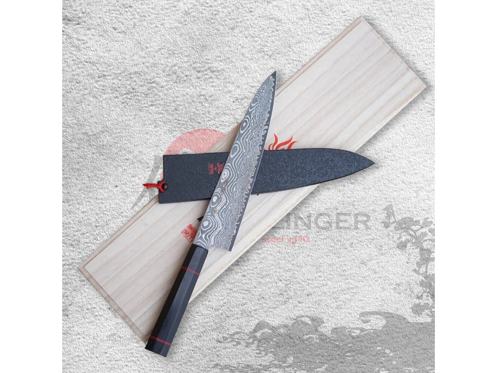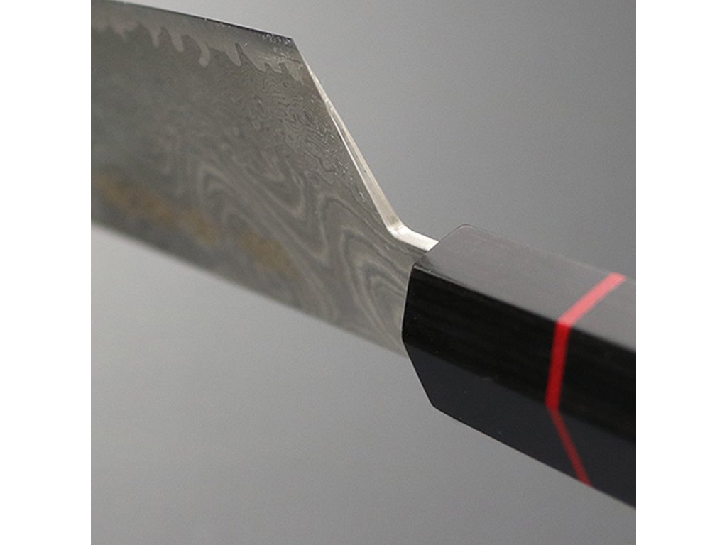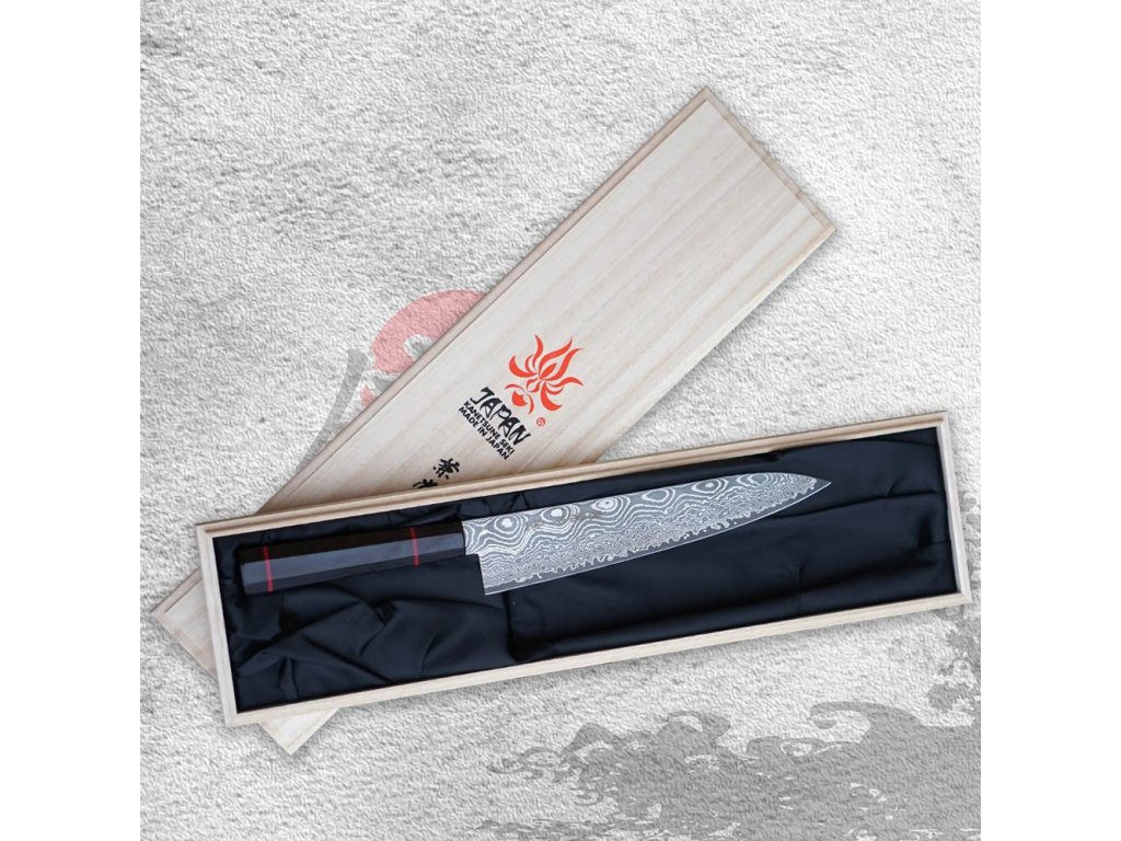 Japonský nůž šéfkuchaře Gyuto/Chef ze série Kanetsune Damascus Namishibuki series. Čepel nože je složena ze 101 vrstev damaškové oceli s jádrem z vysokořezné práškové oceli o tvrdosti HRC 60,5-61,5. Oktagonová rukojeť z černého Plywood, doplněna červenou mikartou. Luxusní dřevěná krabice, japonská saya ze dřeva magnólie. Délka ostří 210 mm.