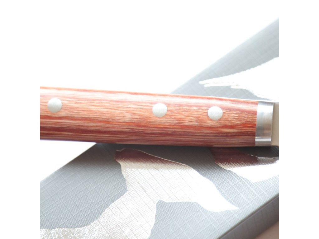 Japonský kuchařský nůž Kengata/Gyuto ze série Kanetsune Hon-Warikomi 2000-series s jádrem z oceli Takefu Shiro 2. Ideální pro krájení naprosté většiny druhů masa, ryb, zeleniny a ovoce. Klasická rukojeť z Plywood se třemi nýty. Délka ostří 180 mm.