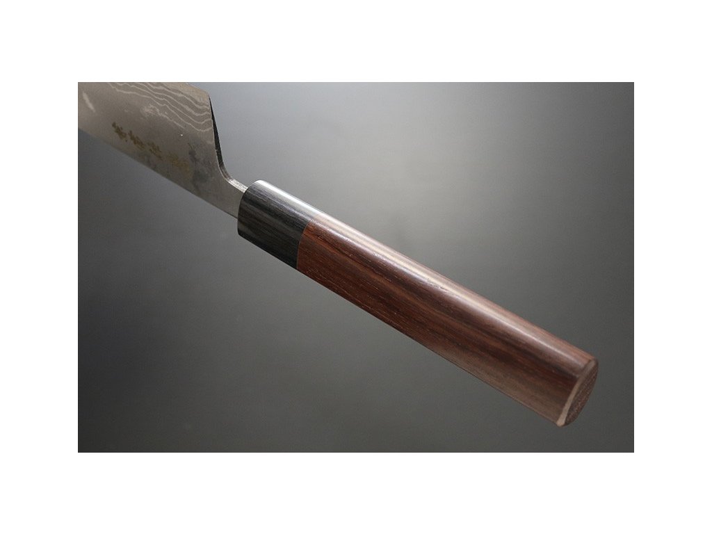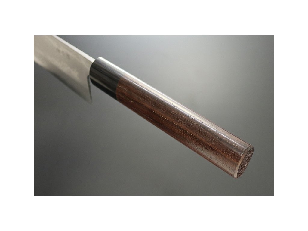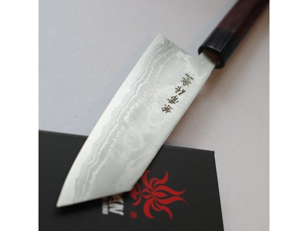 Japonský nůž šéfkuchaře Kiritsuke ze série Kanetsune Blue Steel "Zen-Bokashi" s jádrem z oceli Blue steel #2 (Aogami#2) HRC 61-62, z každé strany 11 vrstev damaškové oceli. Tradiční japonská rukojeť ve tvaru písmene „D“ je vyrobena z červeného santalového dřeva, bolster je z černého dřeva Plywood. Délka ostří 170 mm.