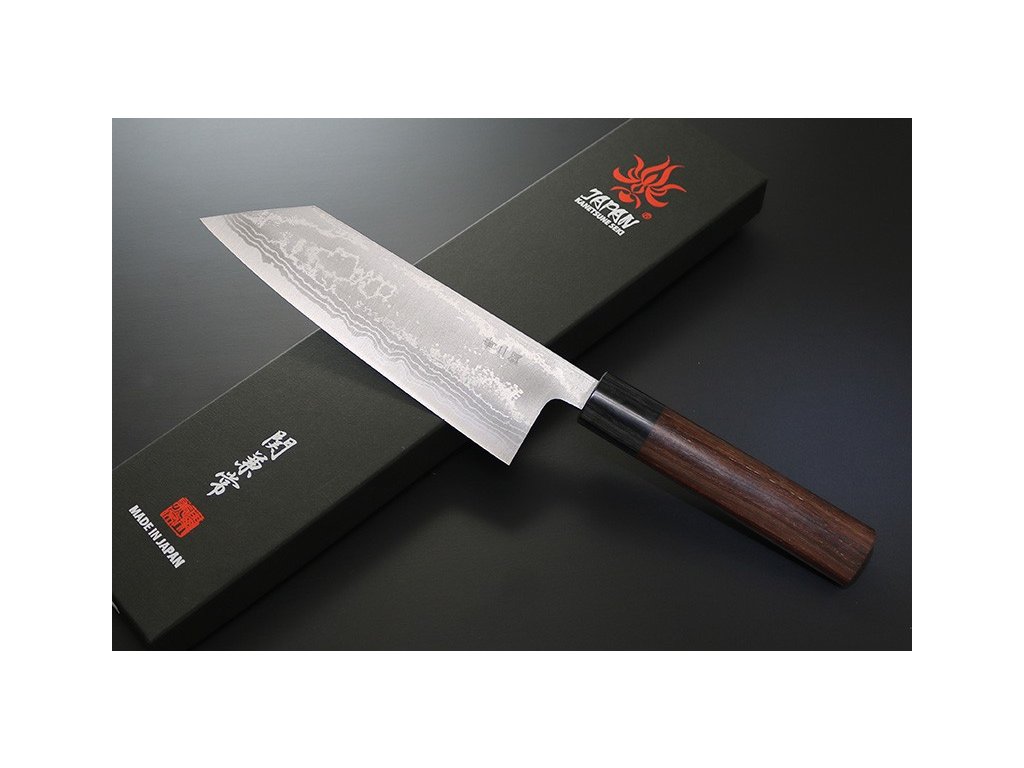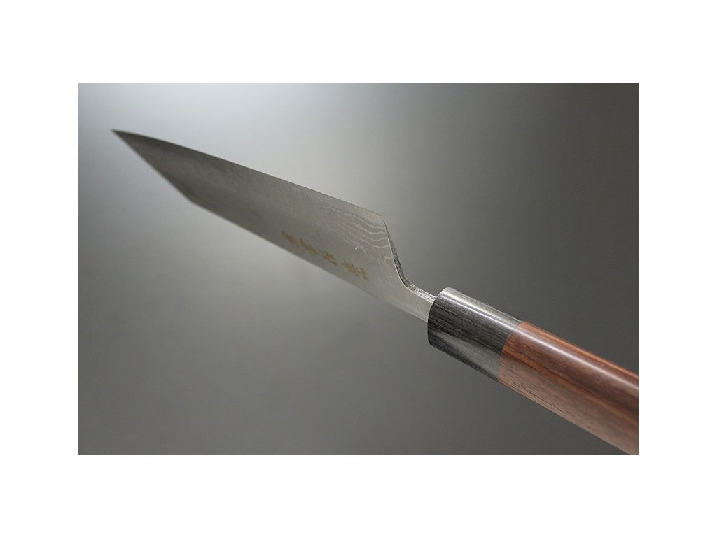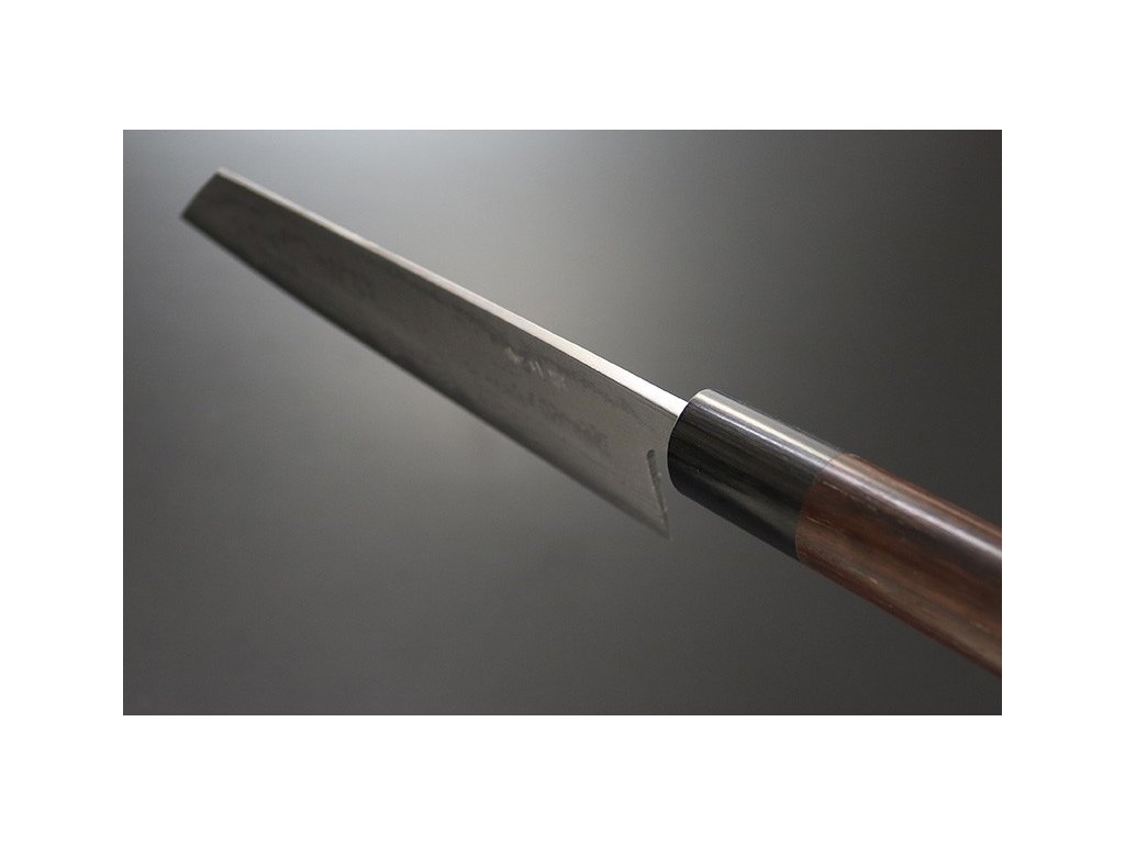Robustní, velmi ostrý japonský nůž Kiritsuke ze série Kanetsune Blue Steel "Zen-Bokashi" s jádrem z oceli Blue steel #2, vloženým mezi 11 vrstev damaškové oceli. Hřbet nože a ostří se zužují do špičky pro všestranné využití mimořádné řezné síly. Krájení, plátkování, čištění masa, ovoce a zeleniny – nic nebude pro tento jedinečný nůž japonského tvaru problémem. Kuchařský nůž Kiritsuke je díky výše položenému hrotu, též vhodný ke kolébkovému krájení bylinek, zeleniny a ořechů. Jelikož je špička čepele modelována podle japonského meče, je vhodná i pro přípravu pokrmů, které vyžadují použití špičky a také pro dekorativní vyřeřezávání. Dlouhá čepel a oválná rukojeť japonského stylu Vám poskytne tu nejlepší kontrolu při řezání a krájení.