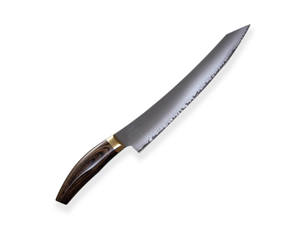 Japonský plátkovací nůž Kiritsuke/Slicer ze série Suncraft Elegancia s jádrem z práškové oceli SG2. Západní rukojeť je vyrobena ze dřeva Pakkawood v barvě ořechu, mosazný bolster. Délka ostří 250 mm.