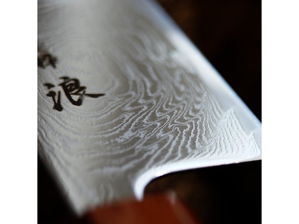 Damaškové nože Hokiyama Sakon Bokusui ROU-Wave s velmi výrazným 32-vrstvým damaškovým vzorem, který obohacuje vizuální stránku čepele - tento vzor je u každého nože jedinečný a nelze jej napodobit. Damaškový vzor je zčásti oblý a zčásti zakřivený, odtud název vířivý damašek. Stejně jako otisk prstu, ani jedna čepel není stejná. Celá čepel je vyleštěna do zrcadlového lesku. Můžete se v ní vidět! Na samém okraji si lze všimnout výrazné, křivkové linie (matný povrch), která se táhne po celé délce čepele. Jedná se o linii mezi jádrem a 32 měkčími, vnějšími vrstvami oceli, které slouží jako dodatečná ochrana ocelového jádra. Takovému sendviči tvrdší oceli jádra a měkčí vnější oceli se říká san-mai clad. Tímto způsobem se vyrábí většina dnešních japonských nožů.