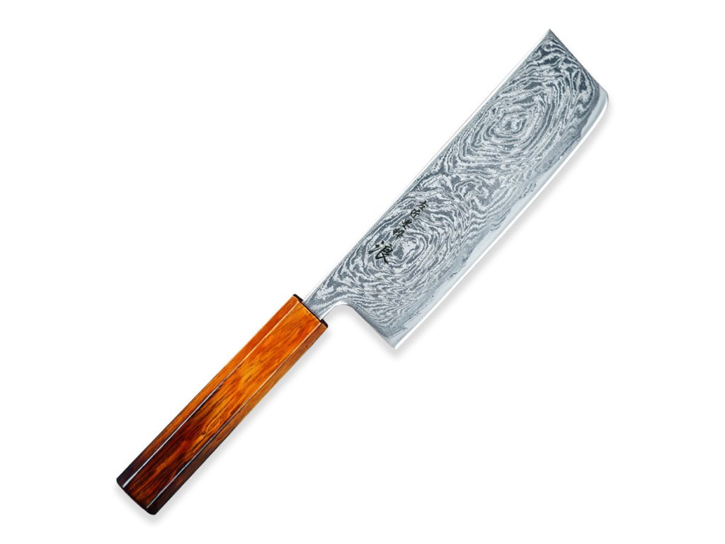 Nůž na zeleninu Nakiri svým tvarem spíše připomíná sekáček na maso, ale nenechte se mýlit. S jeho čepelí snadno nakrájíte veškerou zeleninu na drobné kostičky nebo proužky. Výška nože umožňuje nakrájenou surovinu jednoduše nabrat na čepel a přenést do hrnce či pánve. Je to vynikající nástroj pro profesionální kuchaře i vášnivé kuchaře doma, kteří oceňují kvalitu a tradiční řemeslné zpracování japonských nožů.