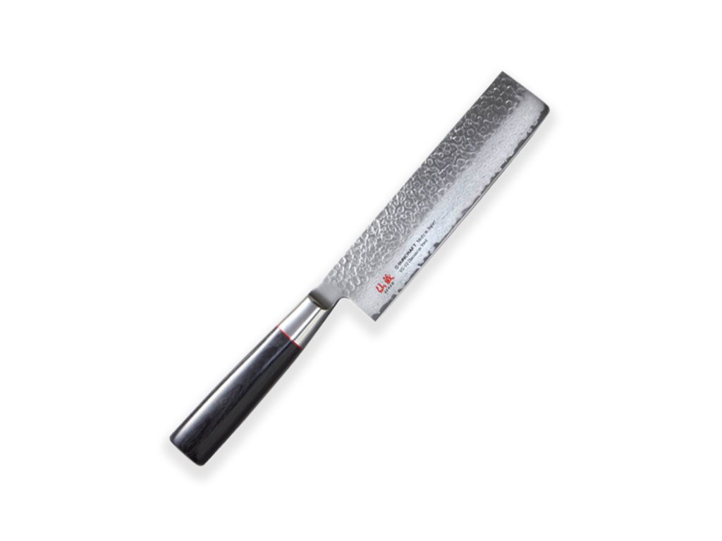 Japonský nůž na zeleninu Nakiri z japonské série Suncraft Senzo Classic Damascus s ultra ostrým řezným jádrem z japonské oceli VG10, vloženým z každé strany mezi 16 vrstev měkké damaškové oceli, s povrchovou úpravou Tsuchime (kladívkový povrch). Západní ergonomická rukojeť je vyrobena z materiálu Pakka-wood. Čepel je od rukojeti oddělena červeným tepelně odolným kroužkem. Tento profesionální nůž je určen na krájení a sekání zeleniny nebo bylinek. Délka ostří 170 mm.
