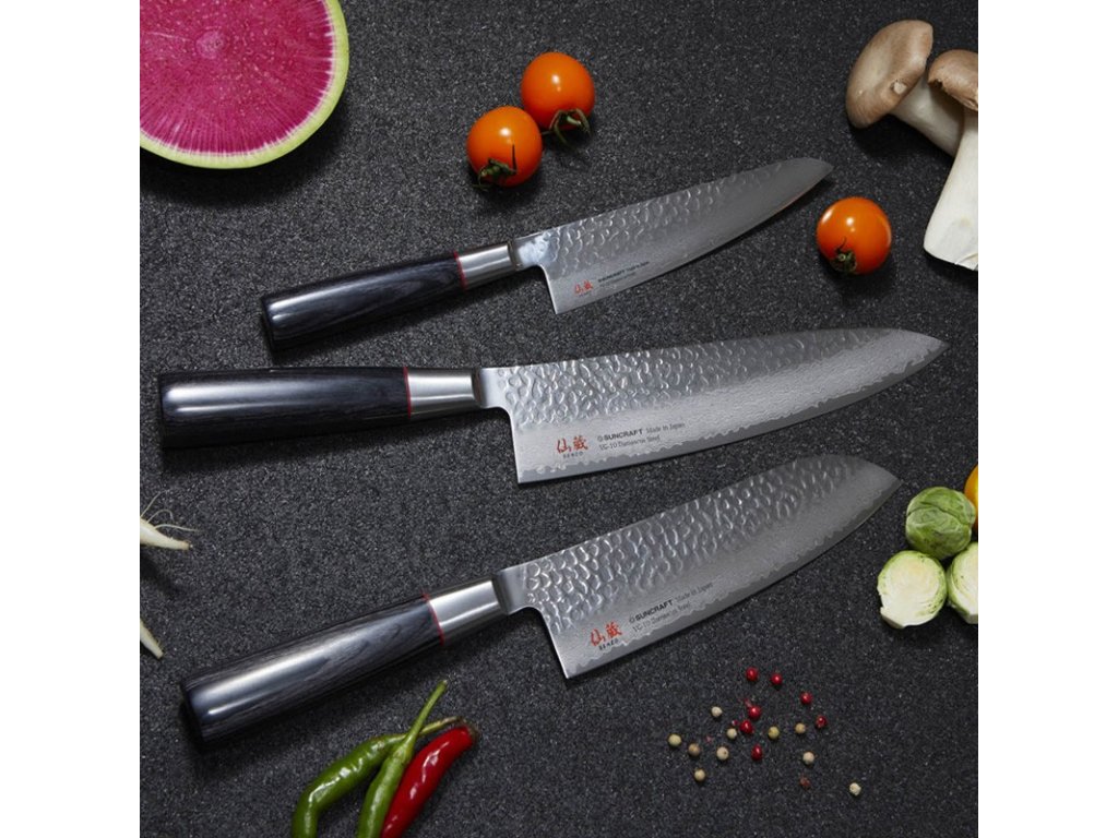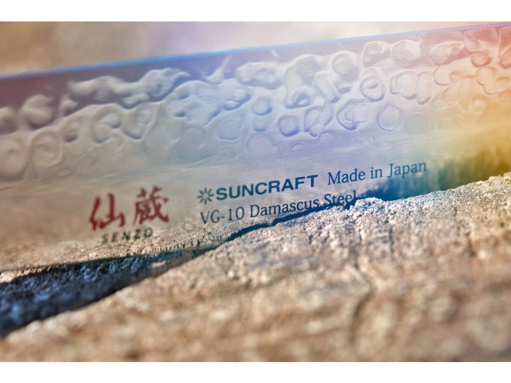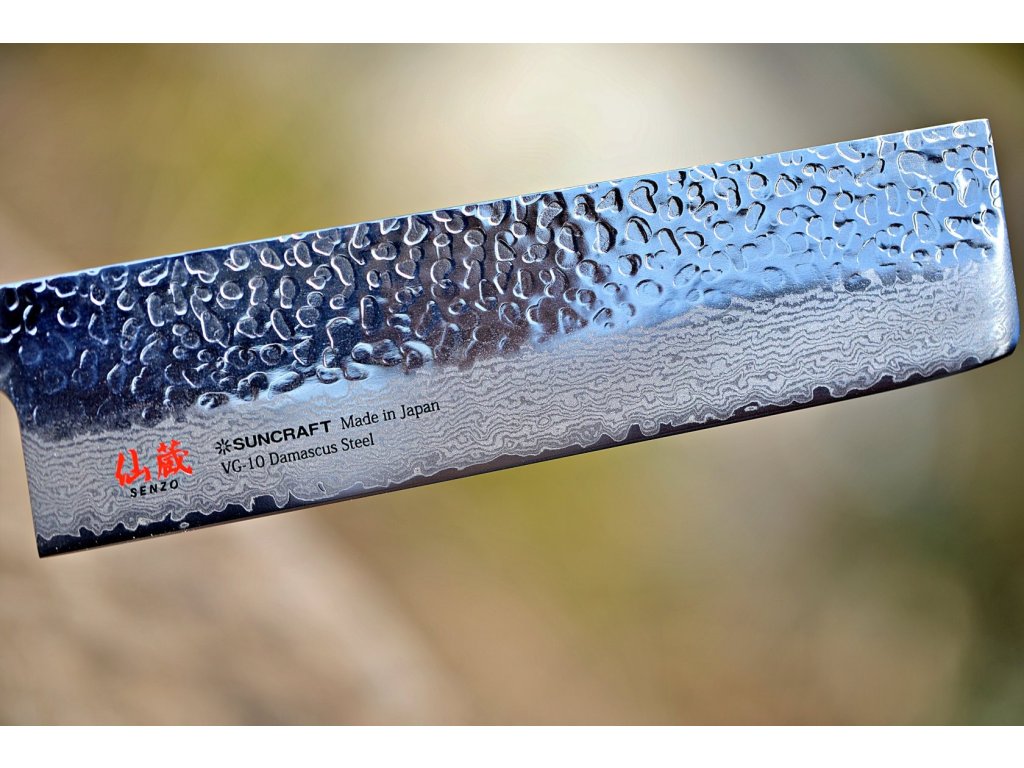 Nože Suncraft Senzo Classic Tsuchime Damascus jsou o něco těžší než standardní japonské nože. Přidaná hmotnost je výsledkem kování čepeli za studena. Obvyklá síla polotovaru před lisováním je 4 mm. Tímto procesem, který se nazývá Tsuchime (kladívkový povrch) získává nůž nejen skvělý vzhled, ale také zabraňuje přilepení krájeného materiálu k čepeli.