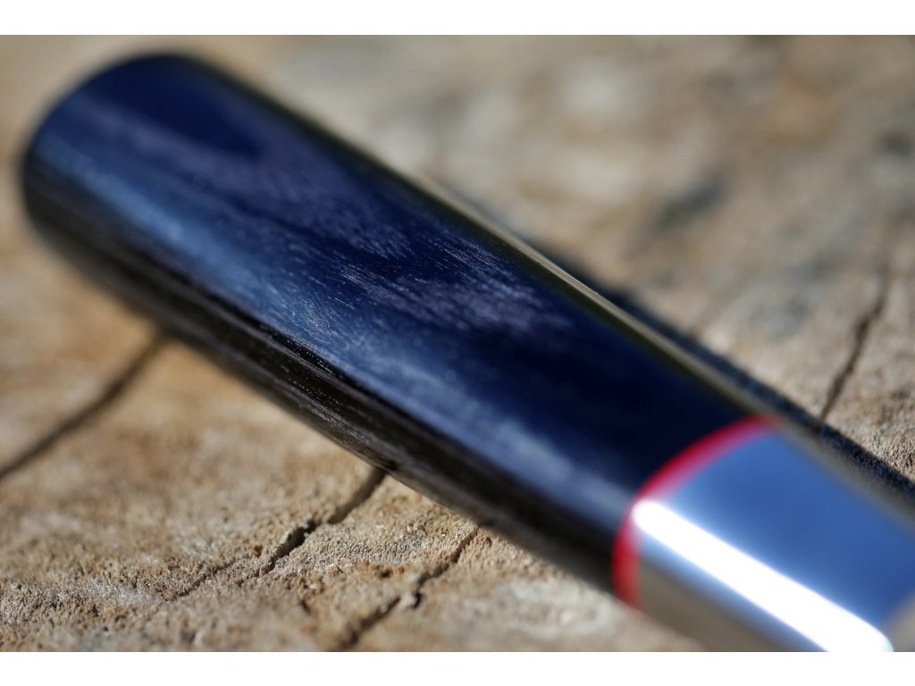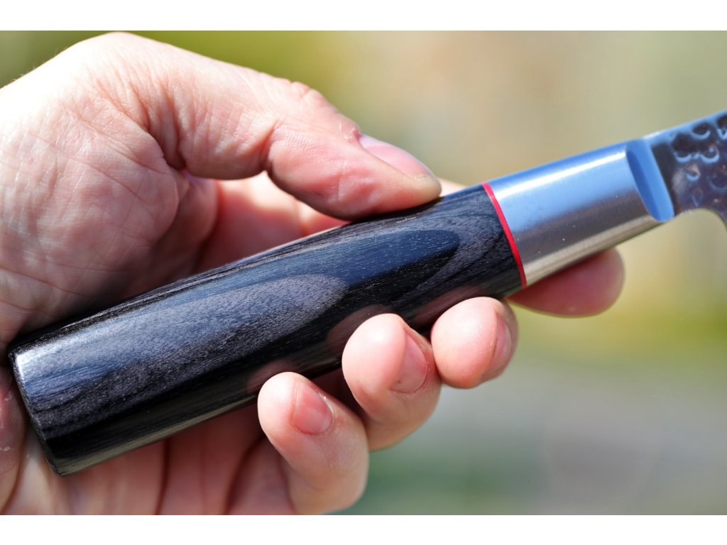Čepel nože je oddělena od rukojeti tenkým červeným tepelně odolným kroužkem, který umožňuje oceli a dřevu se bezpečně rozpínat, smršťovat i při extrémních podmínkách. Rukojeť je vyrobena z materiálu Pakkawood (napodobenina ebenového dřeva). Materiál Pakkawood je velmi dobře odolný proti vodě, vlhku a je zcela bez zápachu. Můžete si být jisti, že materiál nebude korodovat, oxidovat a nestane se v průběhu času měkčím a křehčím. Tento materiál nepotřebuje prakticky žádnou údržbu na rozdíl od tradičních materiálů jako je dřevo.