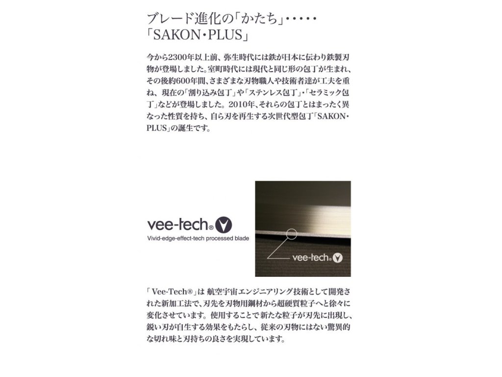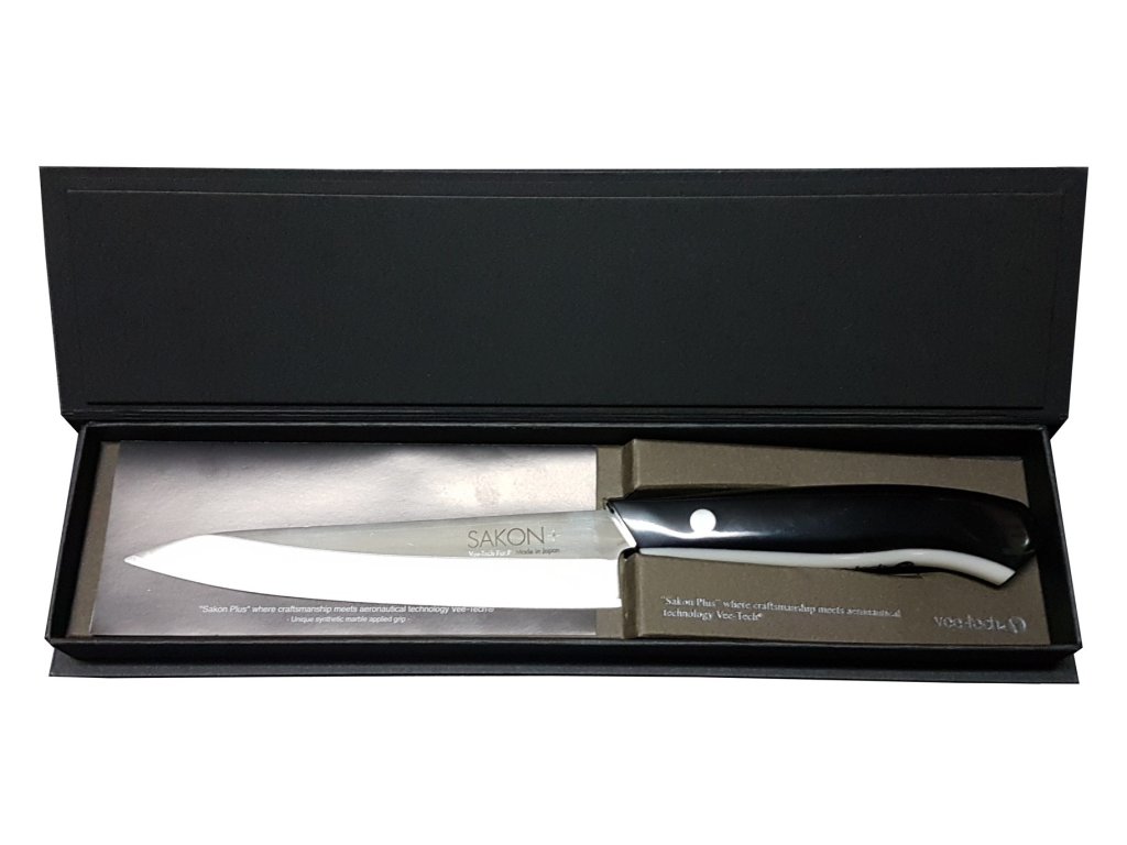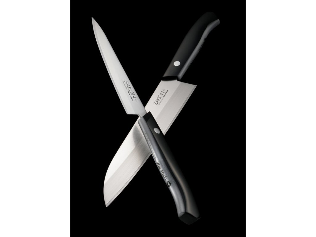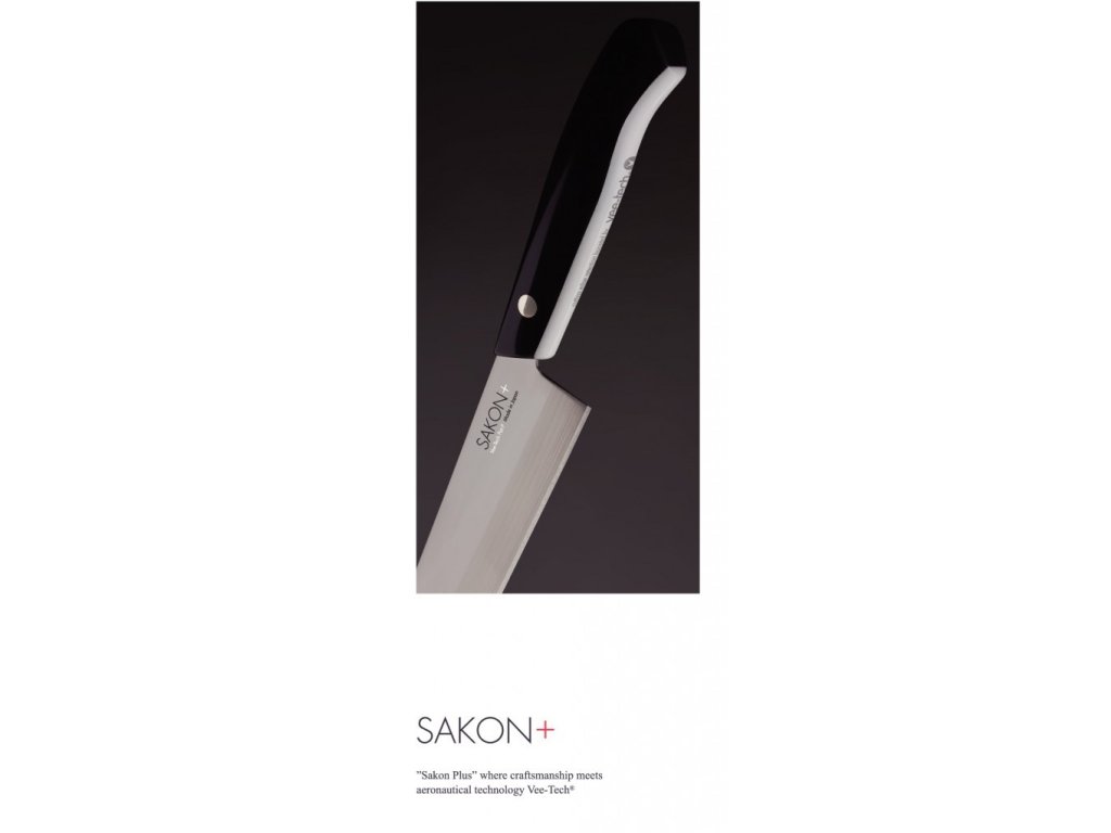 Další výhodou Sakon+ Vee-Tech ostří je, že jej můžete brousit podle potřeby kdykoliv za použití konvenčních brousků, protože má čepel na bázi nerezové oceli. Tyto nože můžete tedy používat jak v domácí, tak i v profesionální kuchyni. Sakon+ má jedinečnou rukojeť ze syntetického mramoru, který je zobrazením elegance a chladné krásy. Materiál je neporézní a při správném čištění (vodou a čistícím prostředkem) odolává plísním a bakteriím. To je veškerá péče, kterou Váš nůž Sakon+ potřebuje.