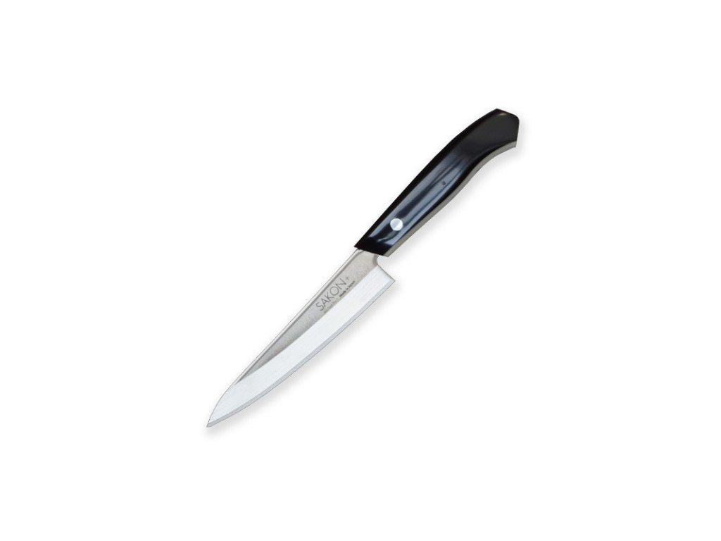 Japonský kuchyňský nůž Petty Hokiyama Sakon+ Vee-tech s délkou čepele 135 mm. Inovativní přístup k řezání, který je inspirovaný novými technologiemi, funkčností a klasickým japonským designem. Rukojeť nože je vyrobena ze syntetického mramoru.