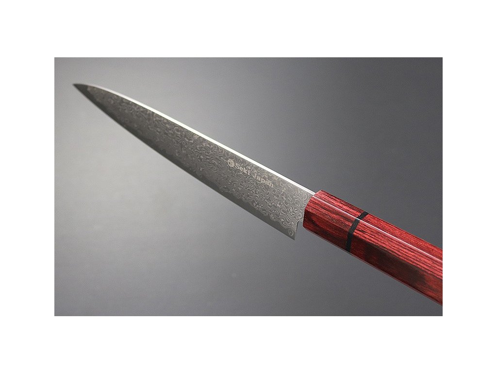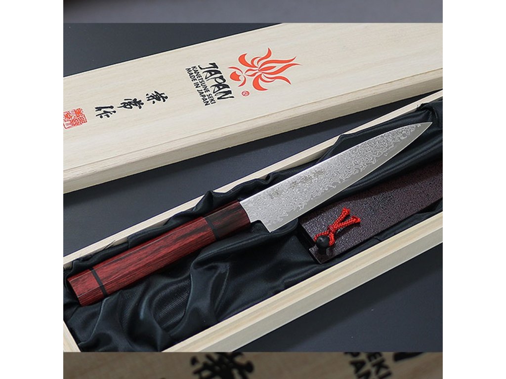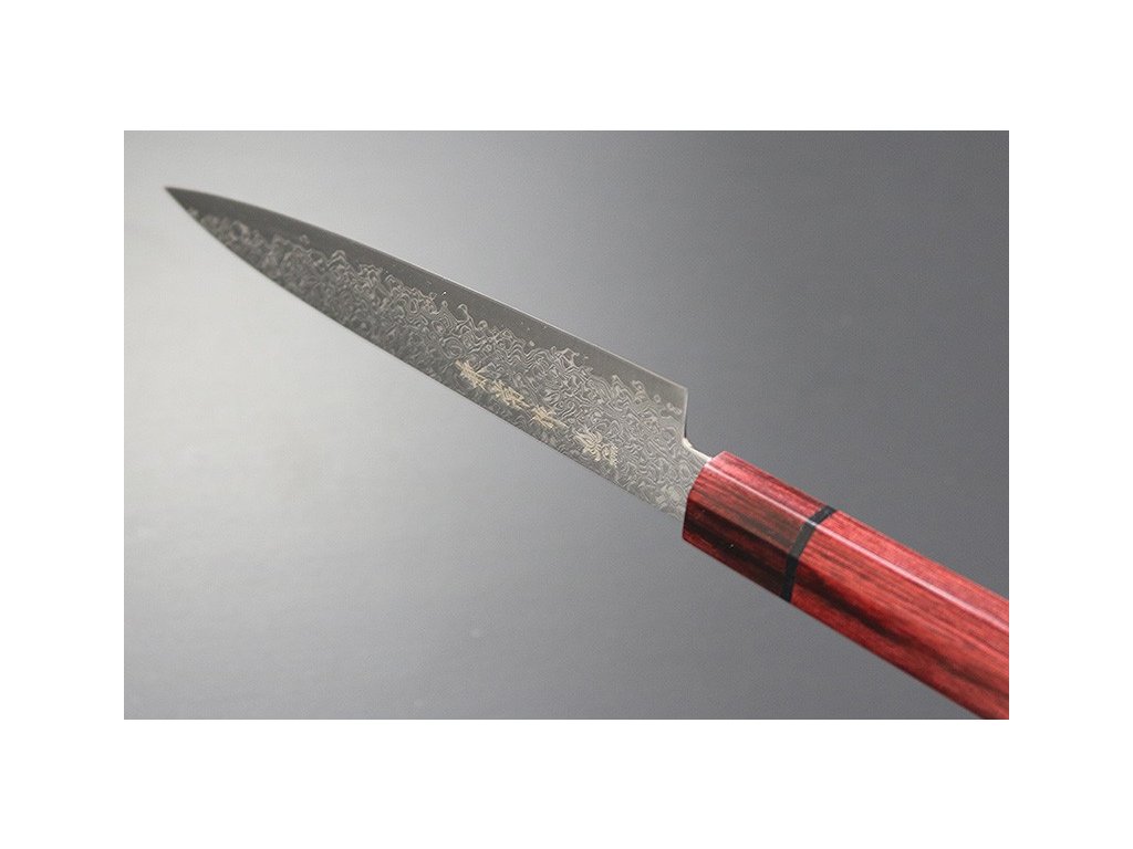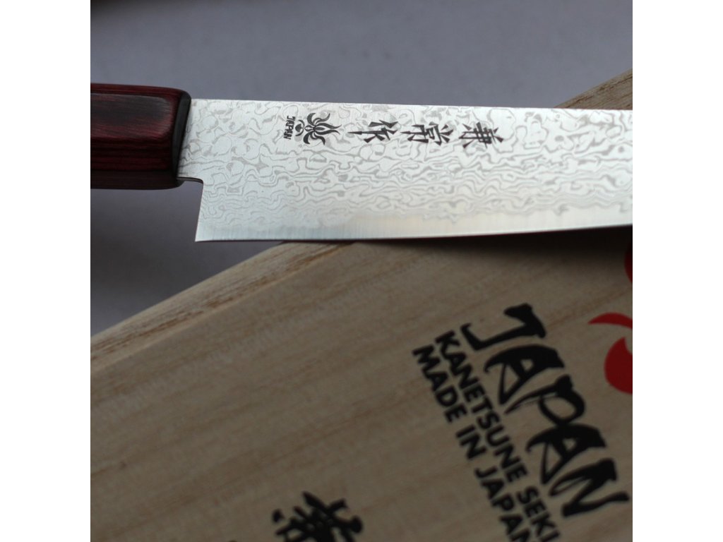 Japonský univerzální nůž Petty ze série Kanetsune Damascus Minamo-Kaze series. Čepel nože je složena ze 63 vrstev damaškové oceli s jádrem z oceli s vysokým obsahem uhlíku o tvrdosti HRC 61 ± 0,5. Japonská tradiční oktagonová rukojeť z červeného Plywood, doplněna černou mikartou. Luxusní dřevěná krabice, japonská saya ze dřeva magnólie. Délka ostří 135 mm.