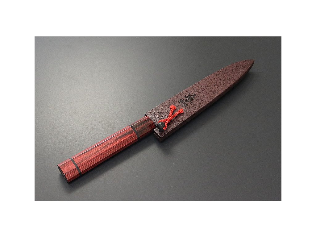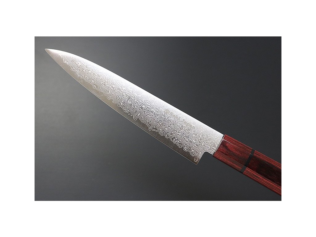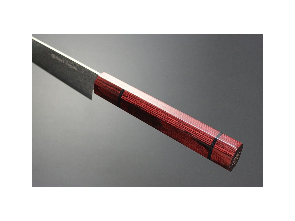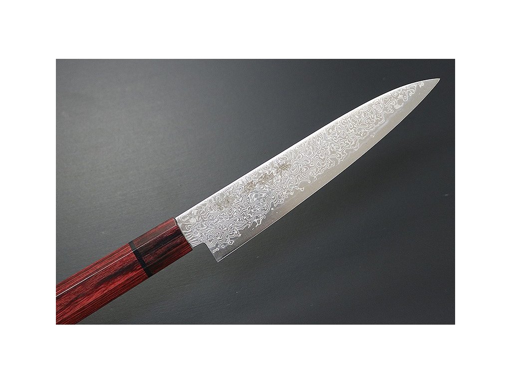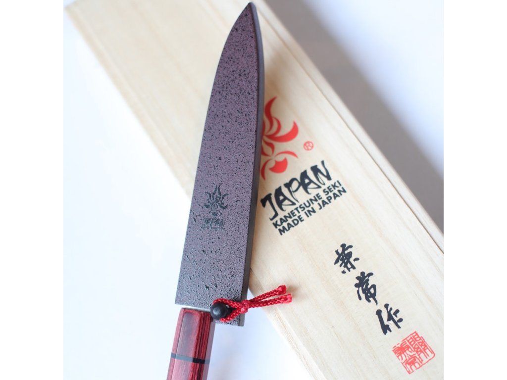 Japonský univerzální nůž Petty ze série Kanetsune Damascus Minamo-Kaze series. Čepel nože je složena ze 63 vrstev damaškové oceli s jádrem z oceli s vysokým obsahem uhlíku o tvrdosti HRC 61 ± 0,5. Japonská tradiční oktagonová rukojeť z červeného Plywood, doplněna černou mikartou. Luxusní dřevěná krabice, japonská saya ze dřeva magnólie. Délka ostří 135 mm.