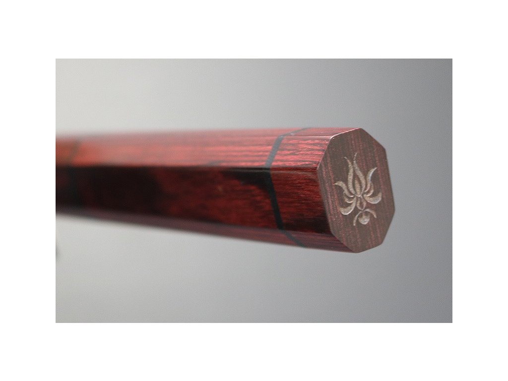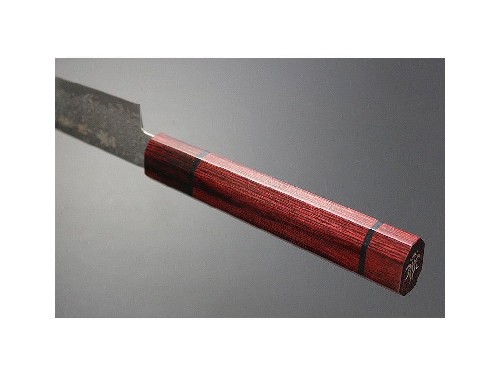 V českém překladu to znamená „odraz na vodní hladině“. A když se zadíváte na atraktivní damaškovou čepel, tak skutečně vypadá jako odraz paprsků na vodní hladině. Je složena ze 63 vrstev damaškové oceli s jádrem z oceli s vysokým obsahem uhlíku o tvrdosti HRC 61 ± 0,5. Japonská tradiční oktagonová rukojeť „八角 柄“ je vyrobena z červeného dřeva Plywood a je vkusně doplněna černými proužky z micarty, na konci rukojeti je vyrytý znak Kanetsune. Způsob uchycení čepele rukojeti Etsuke je zde tzv. naražení na trn, kdy se čepel zahřeje a narazí se do rukojeti. Tento nůž je dodáván v luxusní dřevěné krabici s japonskou sayou (dřevěný kryt na čepel), který je vyroben ze dřeva magnolie s tradiční povrchovou úpravou Kuro-Ishime.