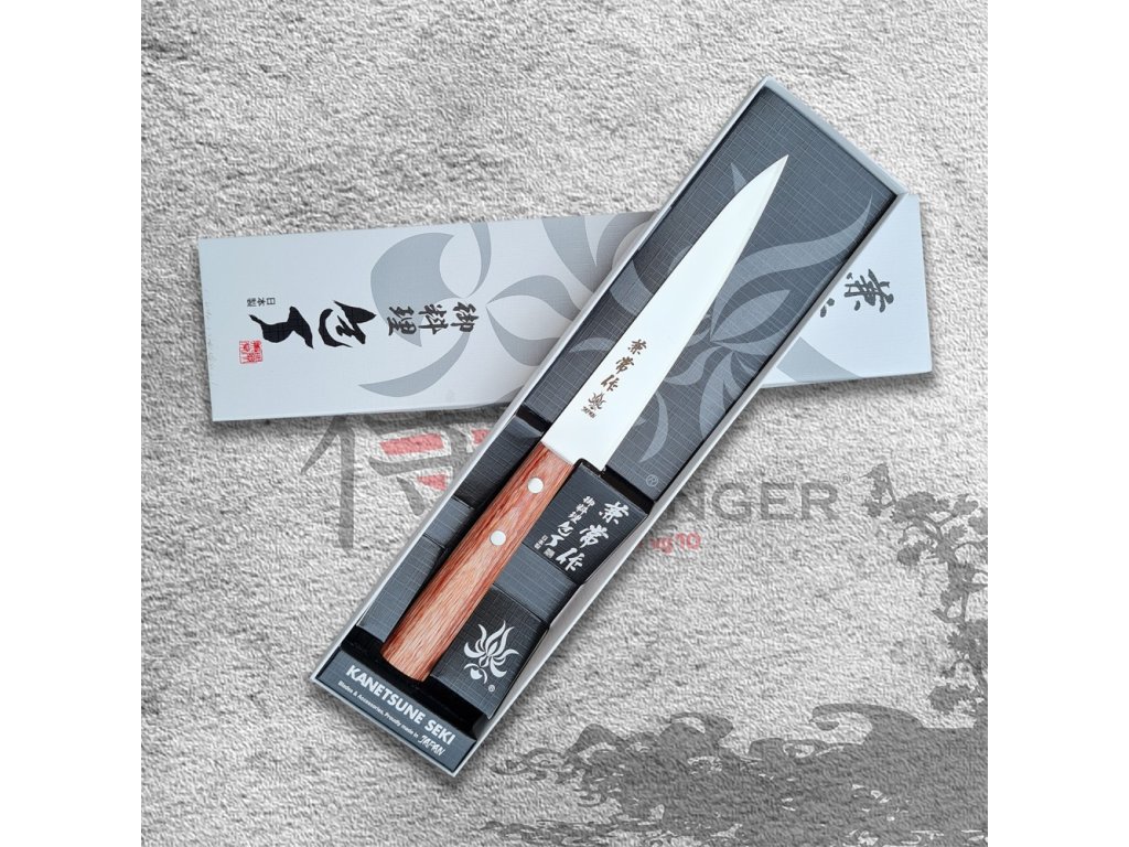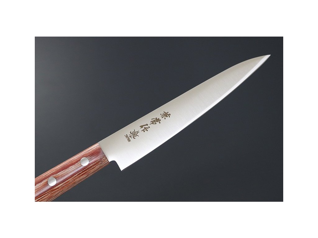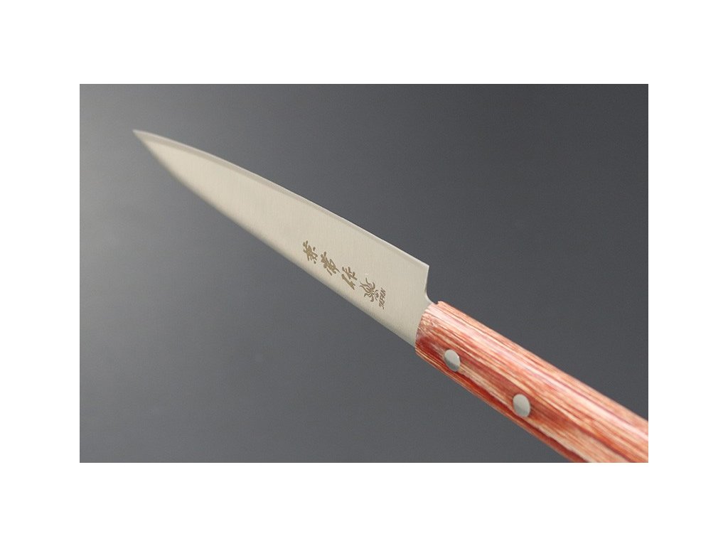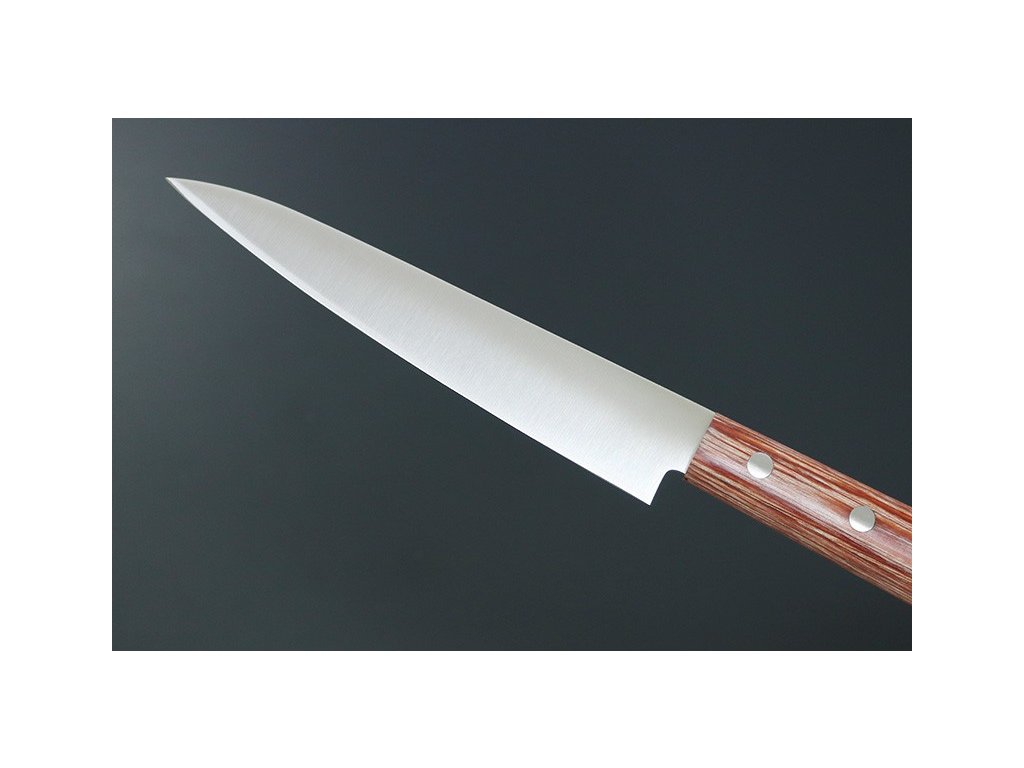 Japonský univerzální nůž Petty ze série Kanetsune 555-series s čepelí z nerezové oceli DSR-1K6, HRC 58-59. Klasická oválná rukojeť je vyrobena z Plywood. Délka ostří 135 mm.